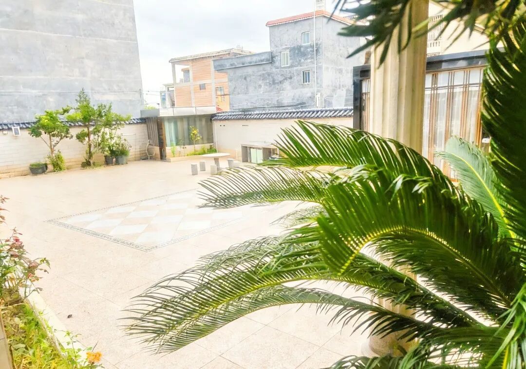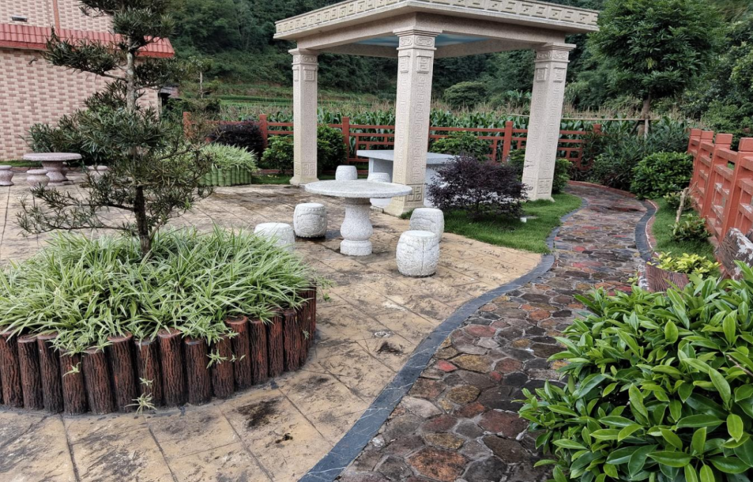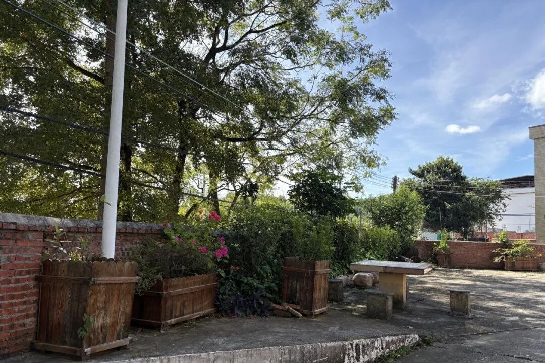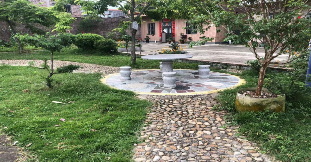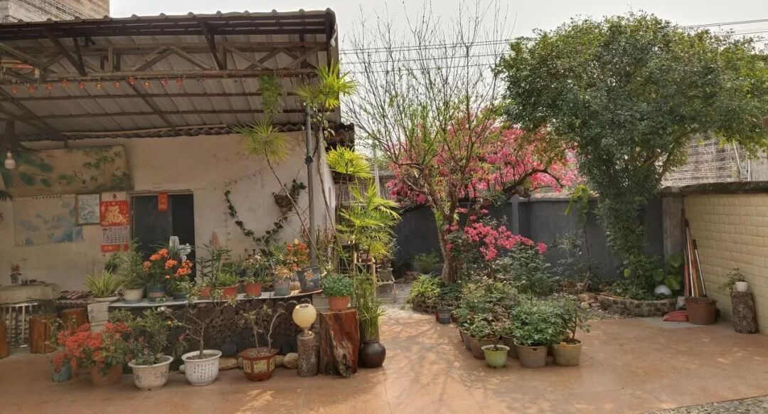 梁仕攸庭院彩色碎石铺就的地面整洁开阔,红砖围墙旁木质花箱里三角梅等花草盛放,大树遮阴下的石桌石凳支起休闲小角,随性布置里透着清新自然的烟火气。