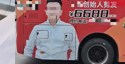 根据网友发布的图片显示,该理发店在公交车身上设置了醒目的广告牌。广告上印有创始人大幅肖像,配文称“创始人剪发,6688元/单次”,并公布了预约电话。