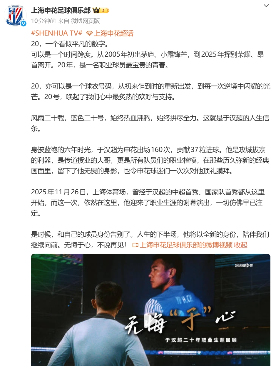 12月29日中午,上海申花俱乐部官方宣布于汉超退役。