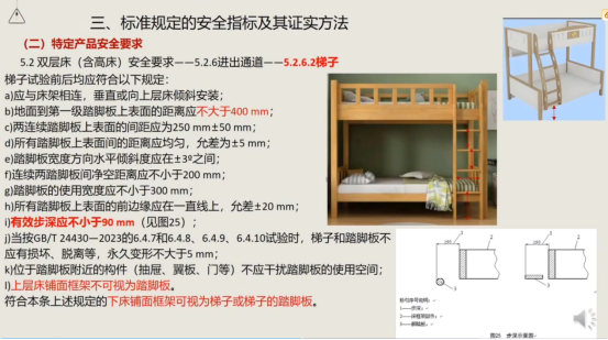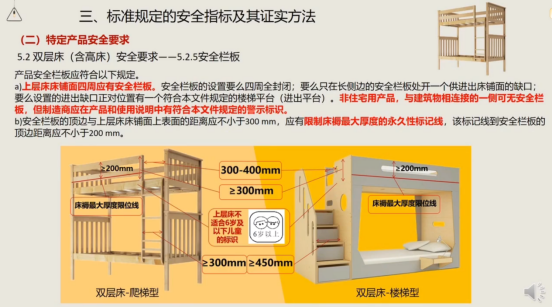 安全栏板:上层床必须设置。栏板顶边距床铺面高度≥300mm,并必须有床褥限厚永久标记线,该线距栏板顶边≥200mm。进出缺口宽度严格限定在300(含)mm至400(含)mm之间。