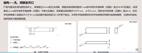 孔、间隙:深度超过10mm的孔及间隙,须防止手指误入:用直径7mm手指探棒施力30N不能通过,或用直径12mm手指探棒不施力应通过。