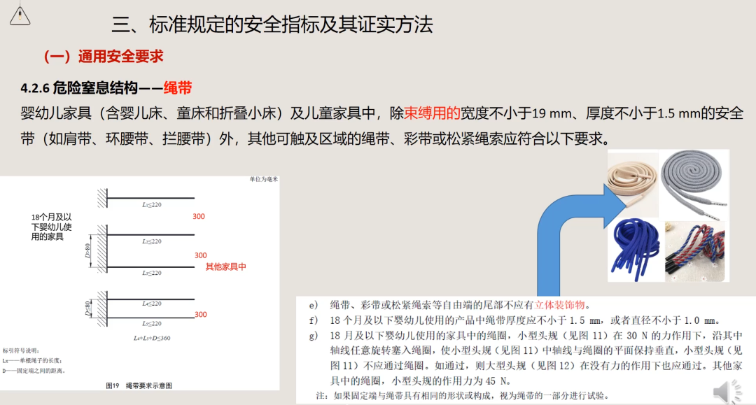 绳带:为防止勒绊风险,家具上可触及绳带的自由长度有严格限制(例如,18个月以下婴幼儿使用的家具,单根绳带长度≤220mm)。