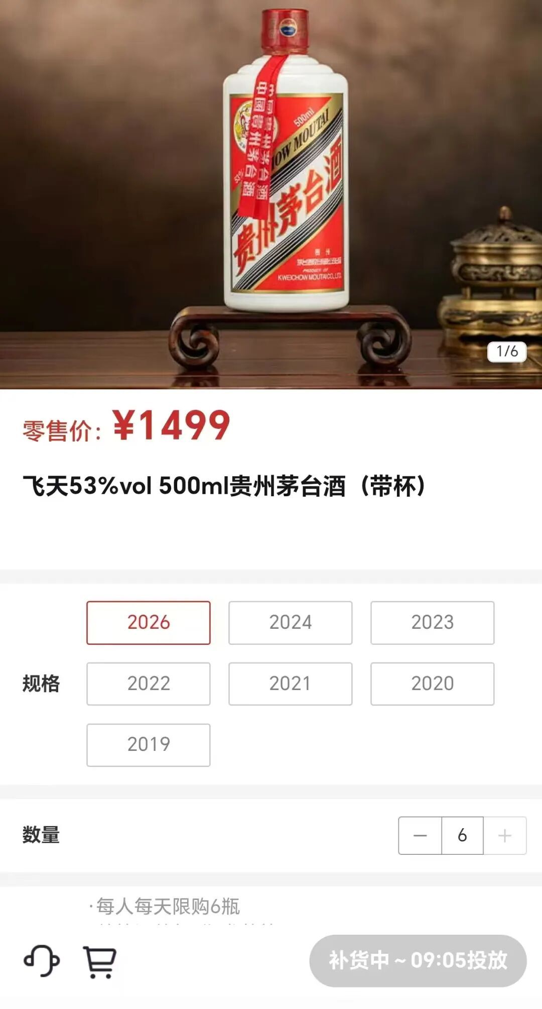 1月3日晚间,小茅i茅台公众号发布消息称,自1月4日至春节前,小茅将每人每日可购买的飞天53%vol 500ml贵州茅台酒(2026)最大数量调整为6瓶。和元旦前的购买政策相比,此次限购数量呈“腰斩”态势。