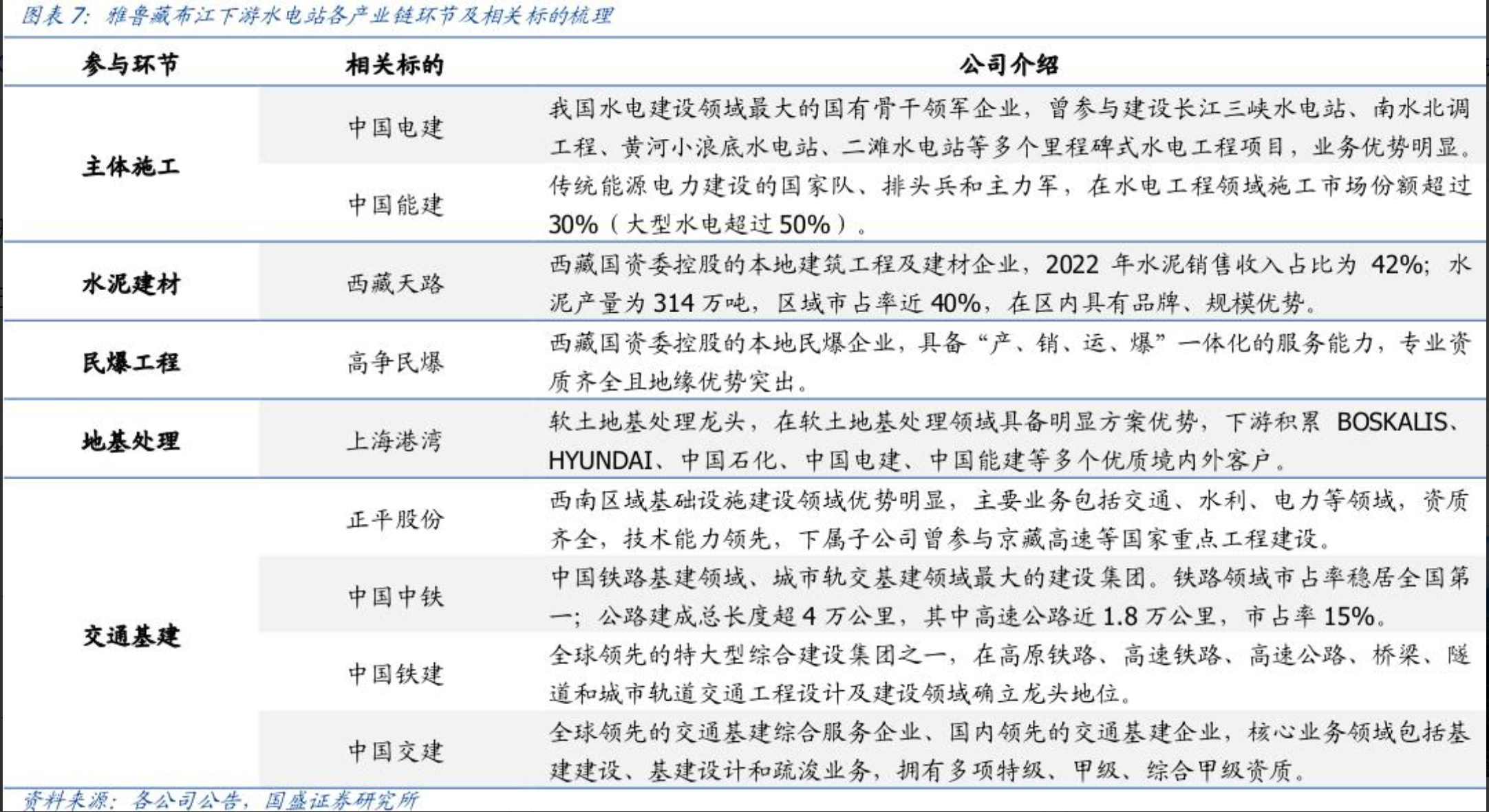 中国能建(601868):传统能源电力建设的国家队、排头兵和主力军,在水电工程领域施工市场份额超过30%,与中国电建有望承接雅鲁藏布江下游水电基地主体部分建设项目。