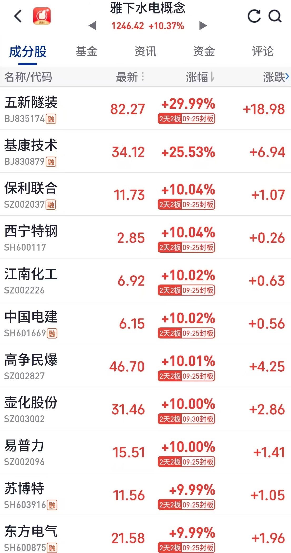 消息公布后,A股水利、基建、建材、民爆及西藏本地股全线爆发。20余只概念股涨停,中国电建、西藏天路、高争民爆等央企及区域龙头一字封板。