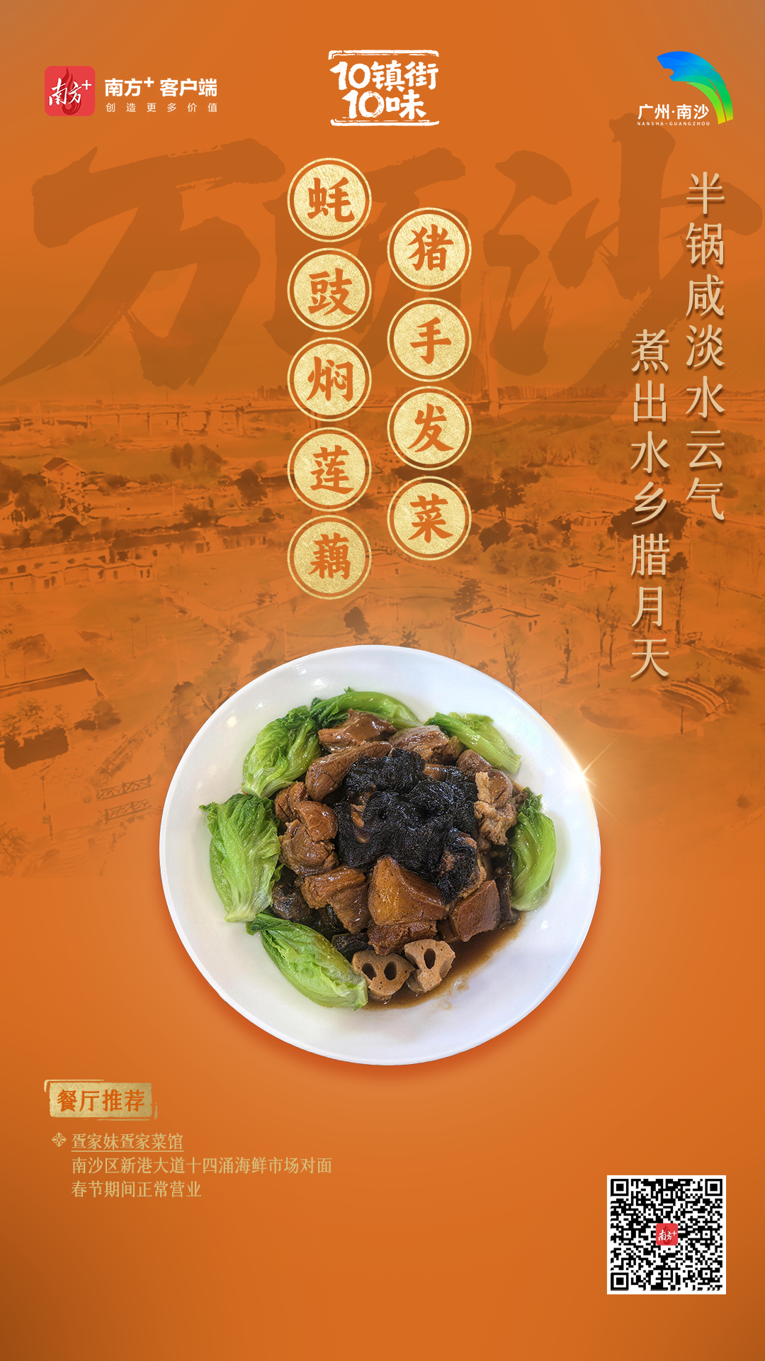 这道菜寓意吉祥:发菜谐音“发财”,蚝豉寓意“好事”,猪手象征“得心应手”,合为发财好事、大吉大利,饱含广府新春祝福,也彰显疍家饮食特色。万顷沙新垦莲藕长于咸淡水交汇处,肉质松粉、藕香浓郁,焖煮后吸满汤汁、软糯入味;猪手胶质丰盈、肥而不腻,发菜与蚝豉提鲜增香。菜品可直接焖制上桌,也可煲汤食用,汤浓味鲜、暖心滋补。