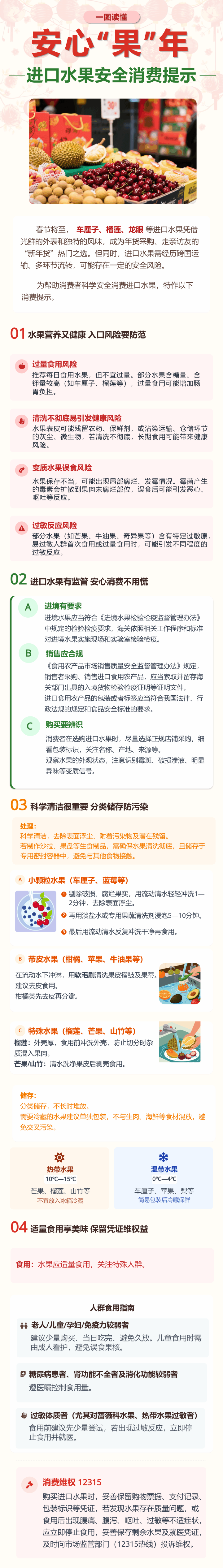 记者今天了解到,春节将至,车厘子、榴梿、龙眼等进口水果凭借光鲜的外表和独特的风味,成为年货采购、走亲访友的“新年货”热门之选。同时,进口水果需经历跨国运输、多环节流转,可能存在一定的安全风险。