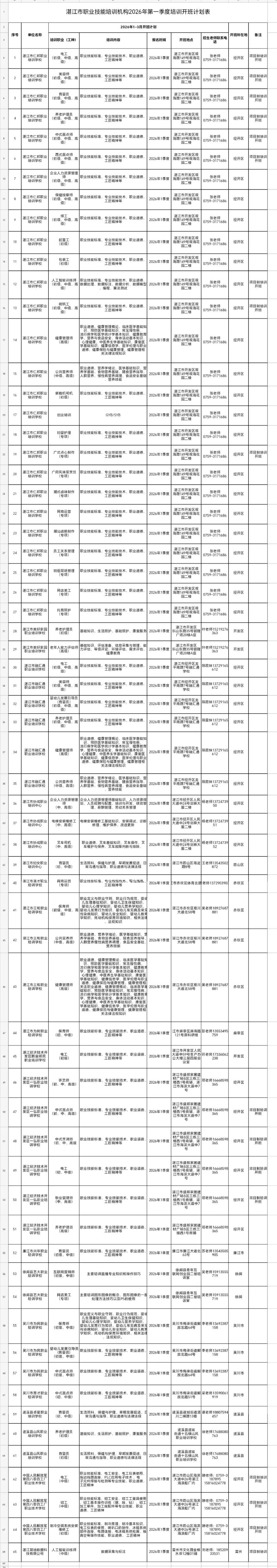 近期,湛江市人力资源和社会保障局整理了湛江市2026年第一季度技能培训班开班计划,详见下表。需要参加线下职业技能培训的小伙伴,请主动联系以下的招生老师,合理安排学习时间。