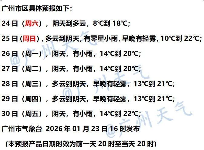 1月25日,珠江三角洲中东部、粤北和粤东市县多云转阴天,有小雨,其余市县多云间阴天,有分散性零星小雨。早晚有轻雾或雾。最低气温:粤北市县7~10℃,雷州半岛市县14~18℃,其余市县10~13℃。