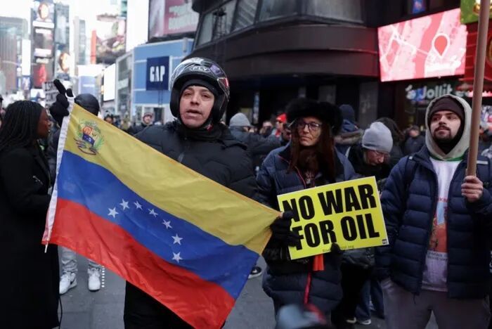 美国民众在纽约时代广场参加示威活动,抗议美国对委内瑞拉发动军事打击。