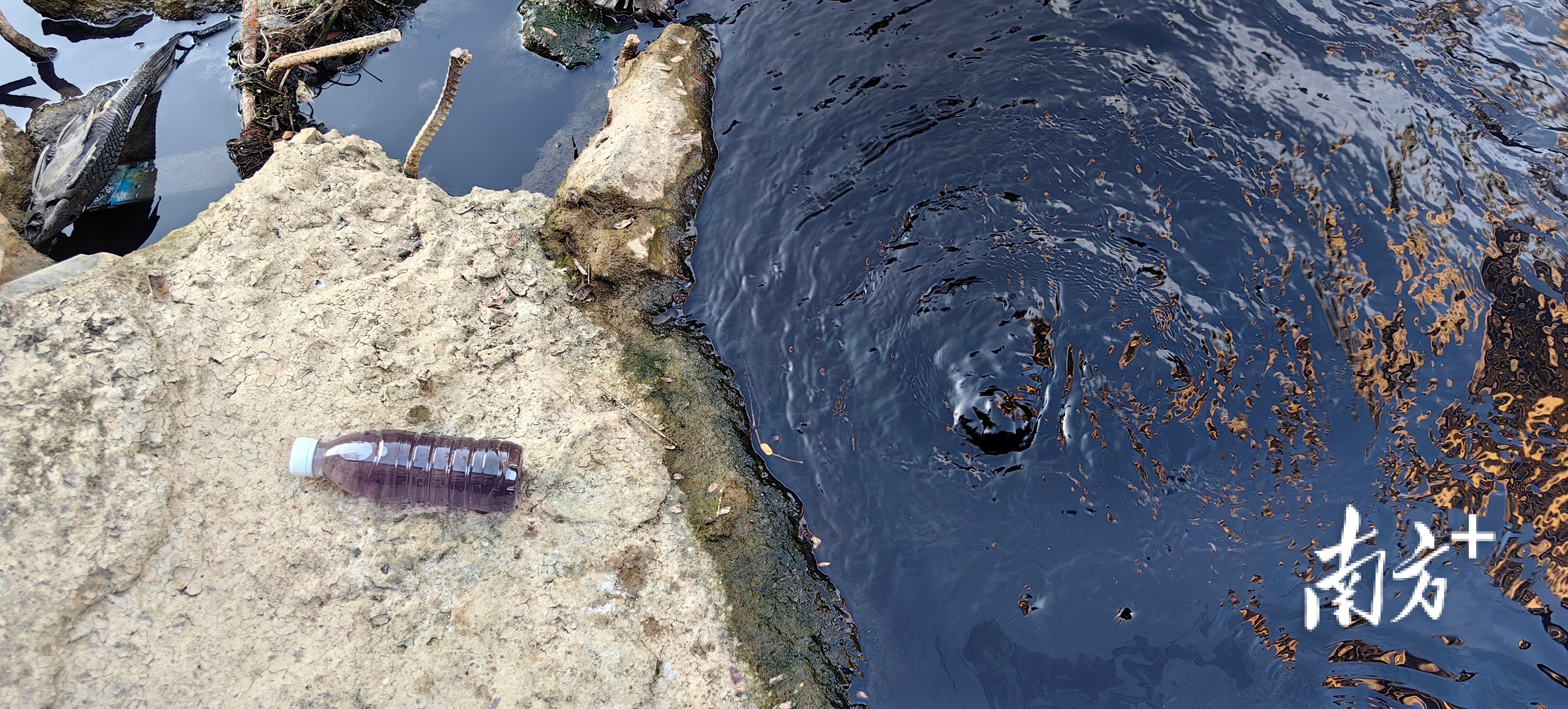抵达平岚大坑平东段岸边时,眼前的景象让人揪心——原本应是清冽的河涌,此刻水体泛着紫黑色,如墨汁般黏稠,岸边的杂草被染成深色。工作人员沿着河涌逆流排查,行至平南村翡翠郡小区对岸时,终于发现症结:河涌堤岸处有多处裂缝,紫黑色的水正从裂缝中不断渗出,顺着堤岸流入平岚大坑,将河水染成了“墨河”。