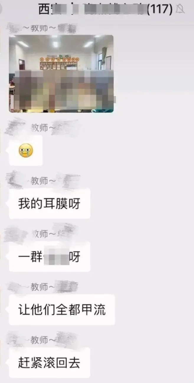 相关群聊截图。聊天记录显示,在百余人的微信群聊中,一个疑似教师身份的微信用户发布了孩子在课堂上的照片,附文称“我的耳膜呀,一群XX,让他们全都甲流,赶紧滚回去”。其表示“这都乱成啥了,我就不管”“工资到手就行”。