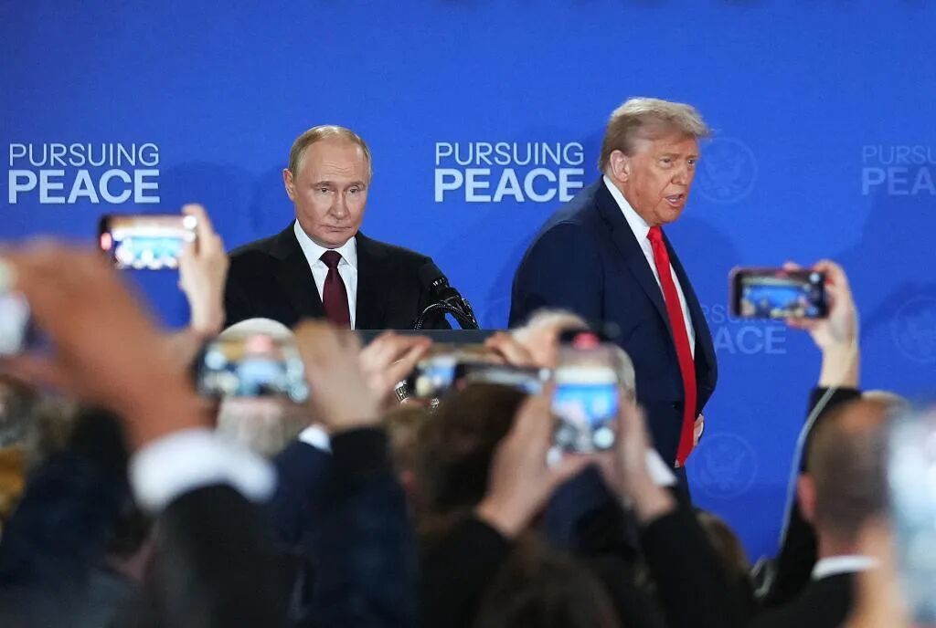 8月15日,特朗普(后右)与普京(后左)在美国阿拉斯加州安克雷奇市埃尔门多夫-理查森联合军事基地举行会晤后共同出席联合记者会。图源:新华社