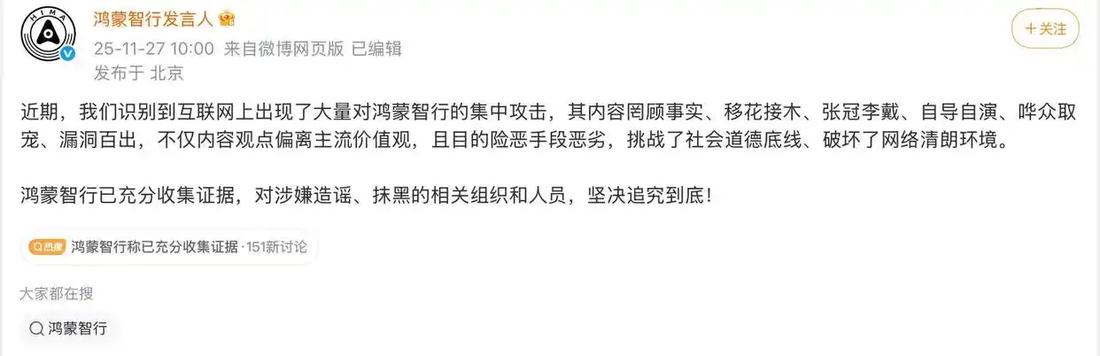 11月27日,“鸿蒙智行发言人”官方微博发文称,近期公司识别到互联网上出现了大量对鸿蒙智行的集中攻击,其内容罔顾事实、移花接木、张冠李戴、自导自演、哗众取宠、漏洞百出,不仅内容观点偏离主流价值观,且目的险恶手段恶劣,挑战了社会道德底线、破坏了网络清朗环境。鸿蒙智行已充分收集证据,对涉嫌造谣、抹黑的相关组织和人员,坚决追究到底。