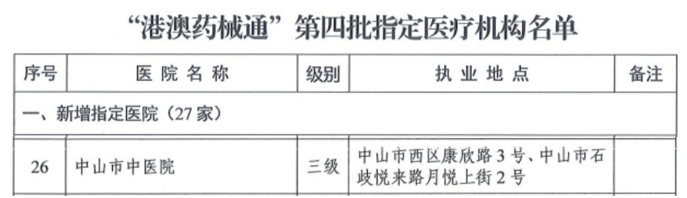 近日,广东省卫生健康委、广东省药品监督管理局联合印发《关于印发粤港澳大湾区“港澳药械通”第四批指定医疗机构名单的通知》,新增包括中山市中医院在内的27家“港澳药械通”指定医疗机构。包含此前入选的中山市人民医院、中山陈星海中西医结合医院,中山市“港澳药械通”指定医疗机构已增至3家。