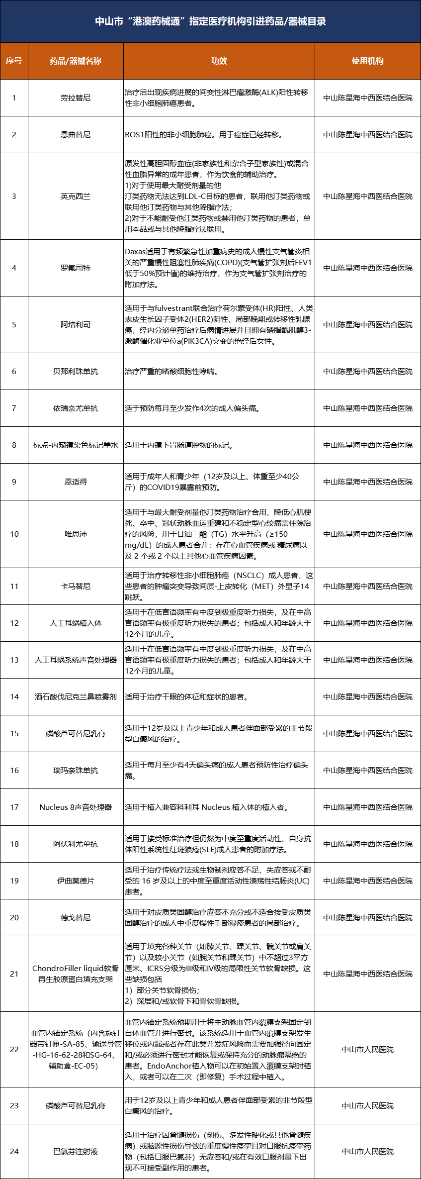 中山市卫生健康局高度重视“港澳药械通”工作,积极申报并做好政策的落地实施。截至目前,中山市指定医疗机构已成功引进18种临床急需、已在港澳上市的药品,以及6种临床急需、港澳公立医院已采购使用、具有临床应用先进性的医疗器械。相关药品器械目录如下表所示,群众可根据需要到对应医疗机构就诊。