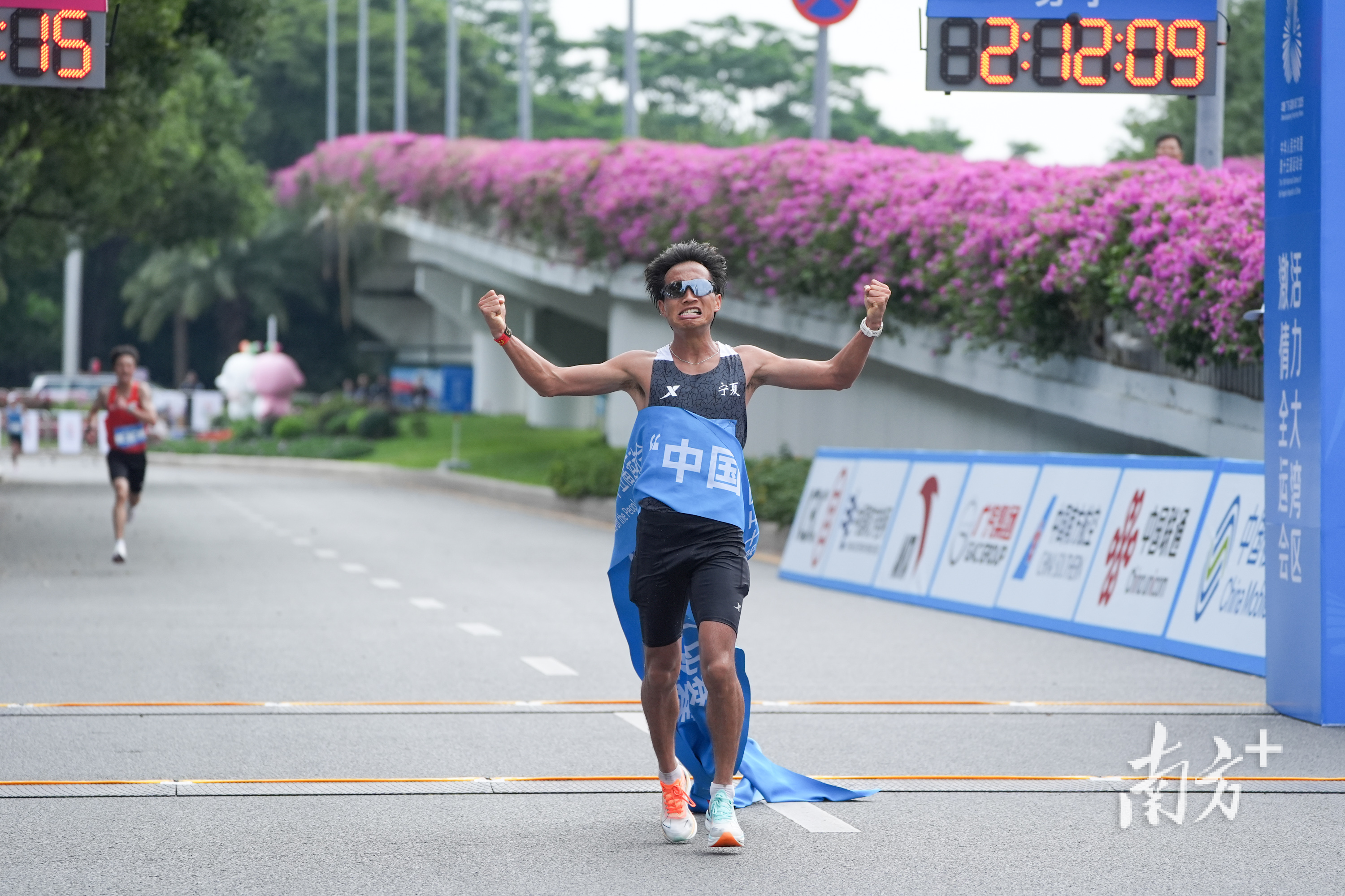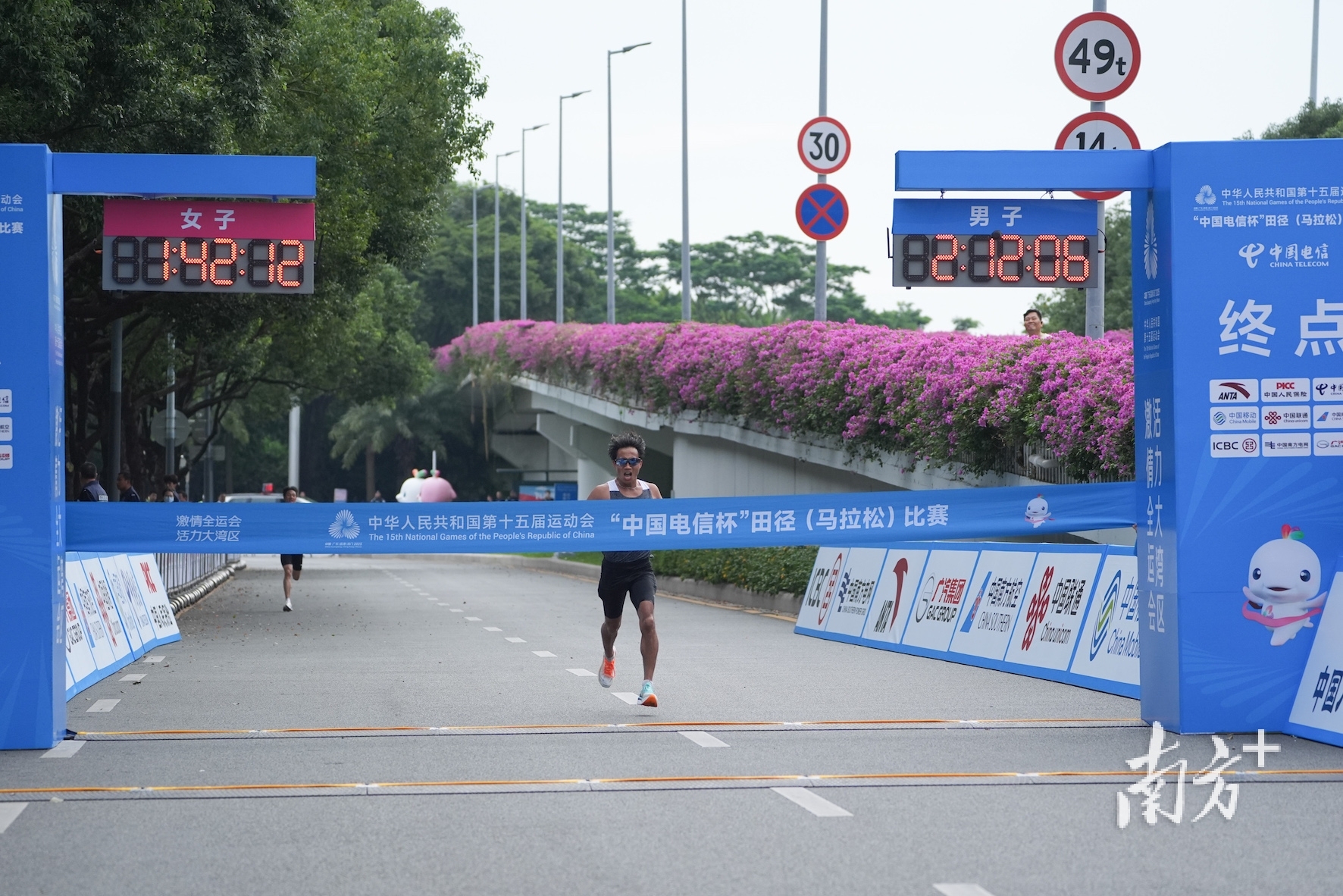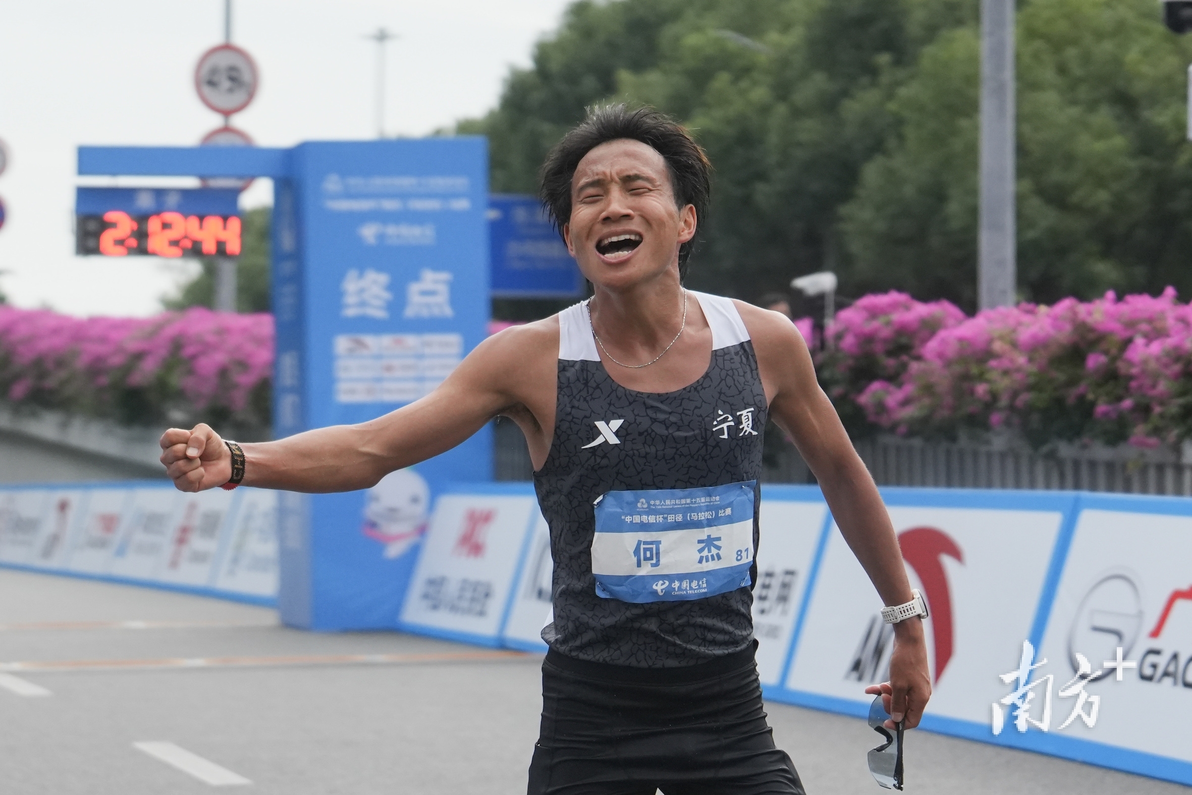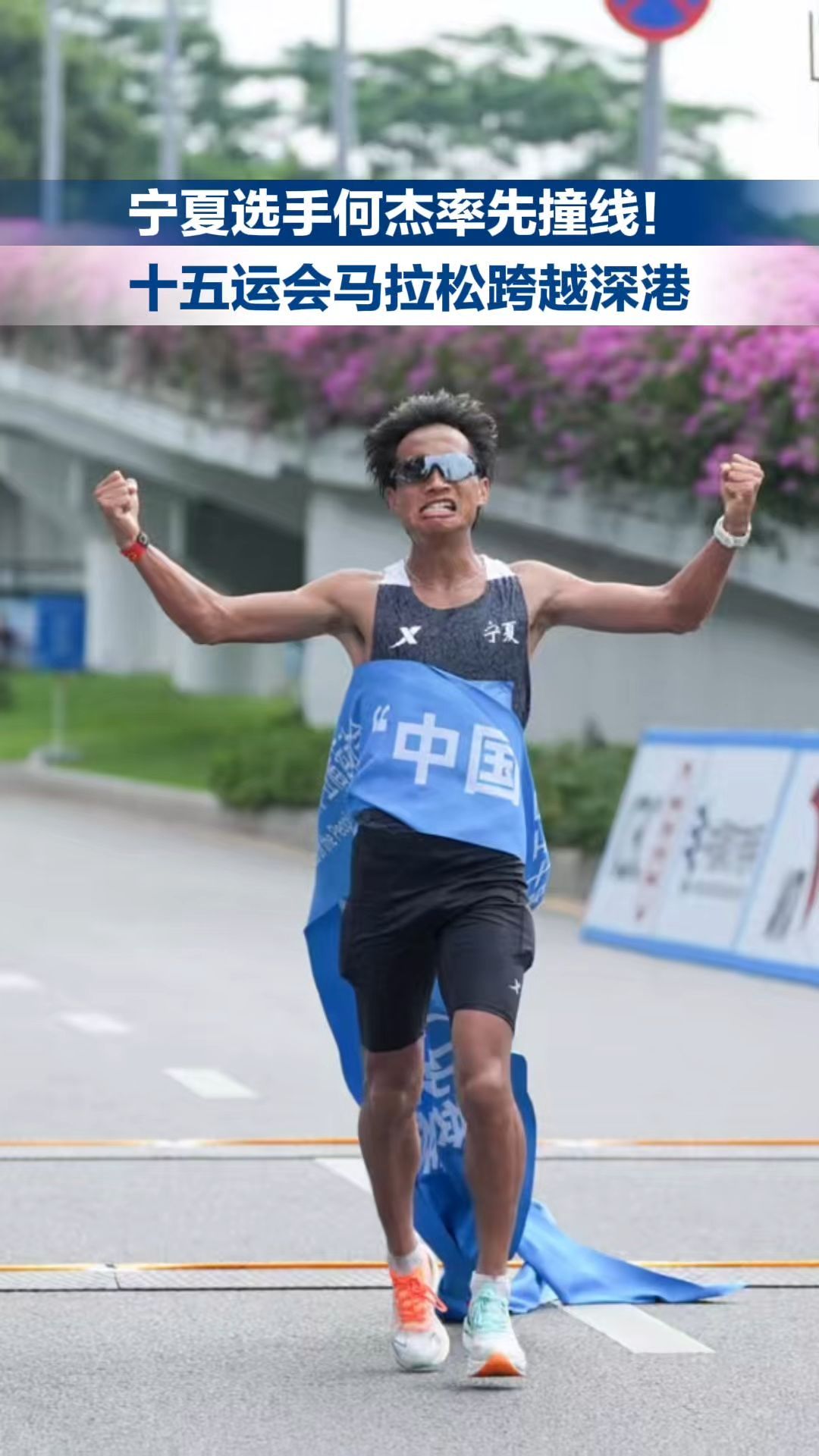 男子马拉松项目中,来自宁夏的选手何杰率先撞线抵达。