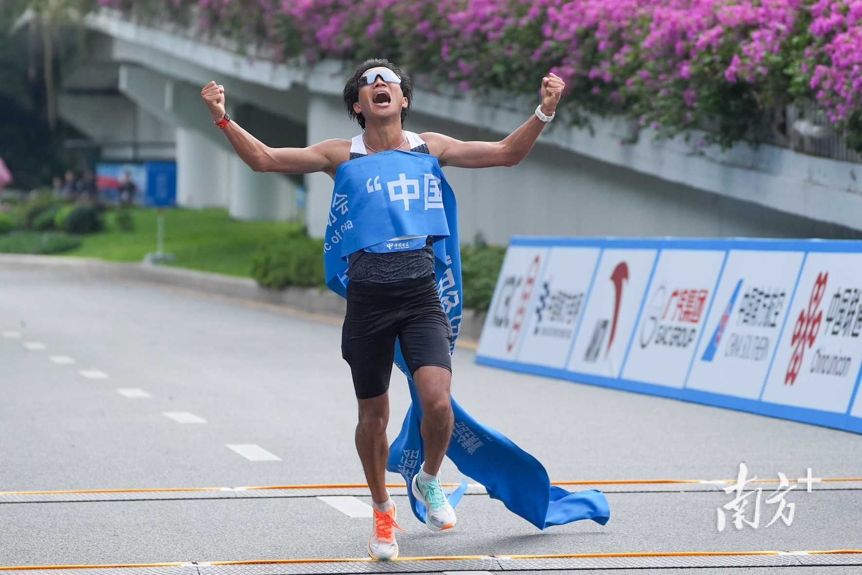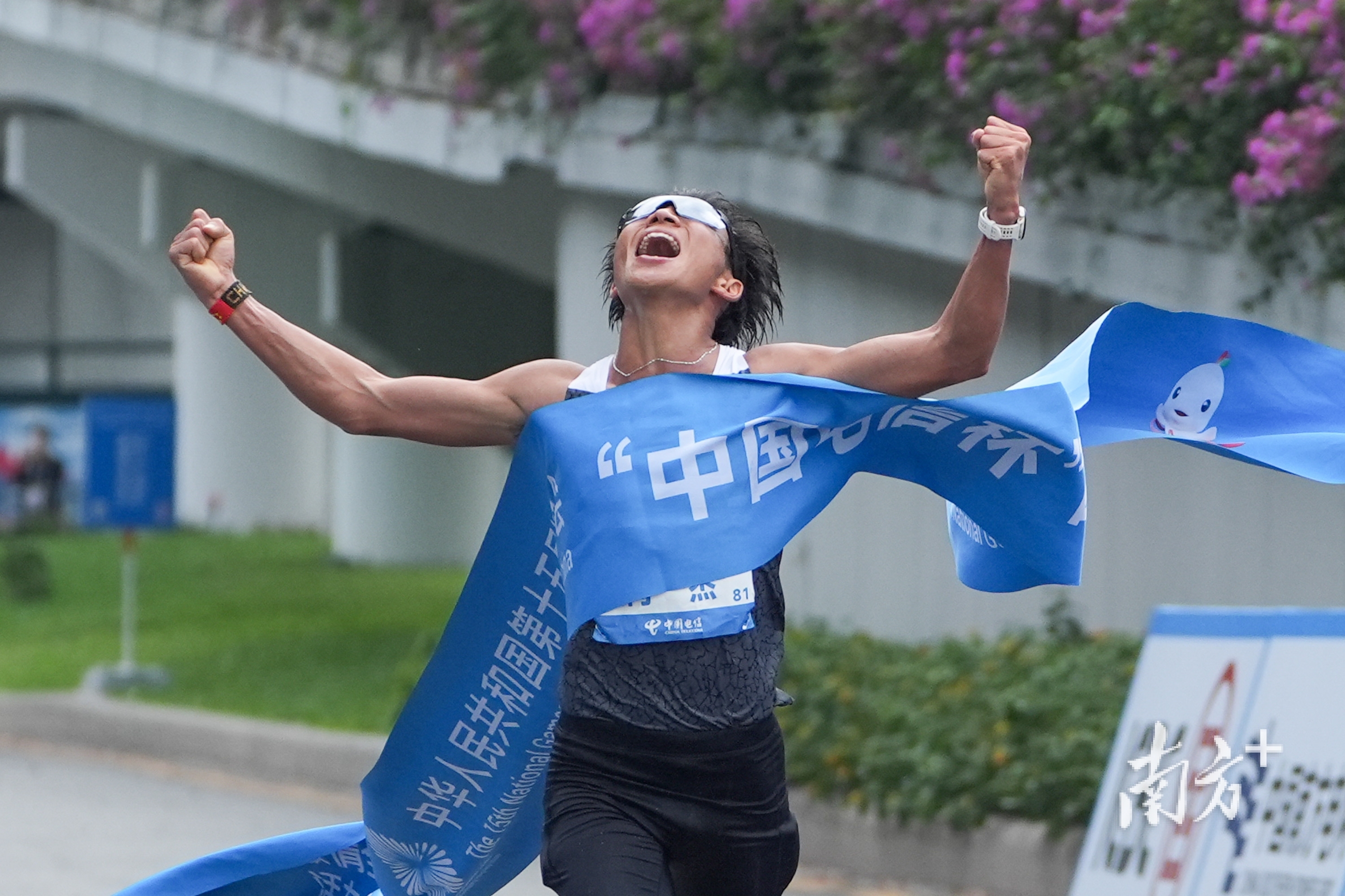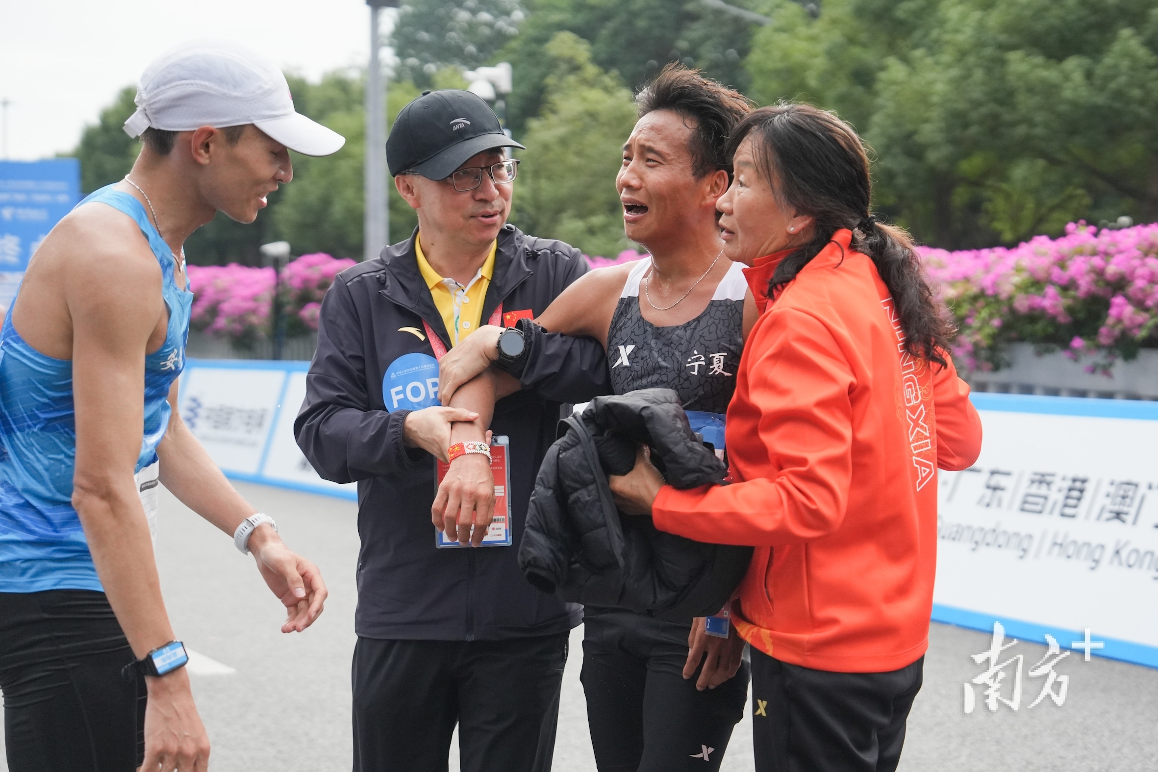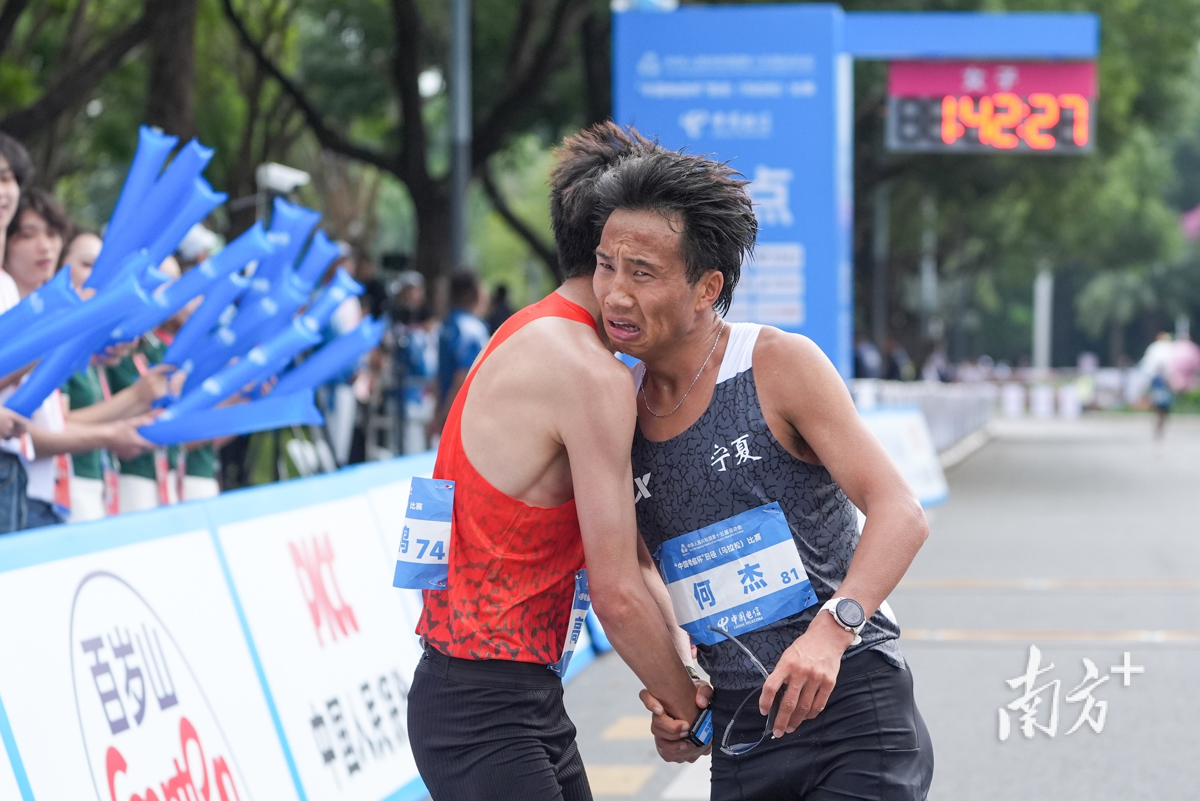 男子马拉松项目中,来自宁夏的选手何杰率先撞线抵达。