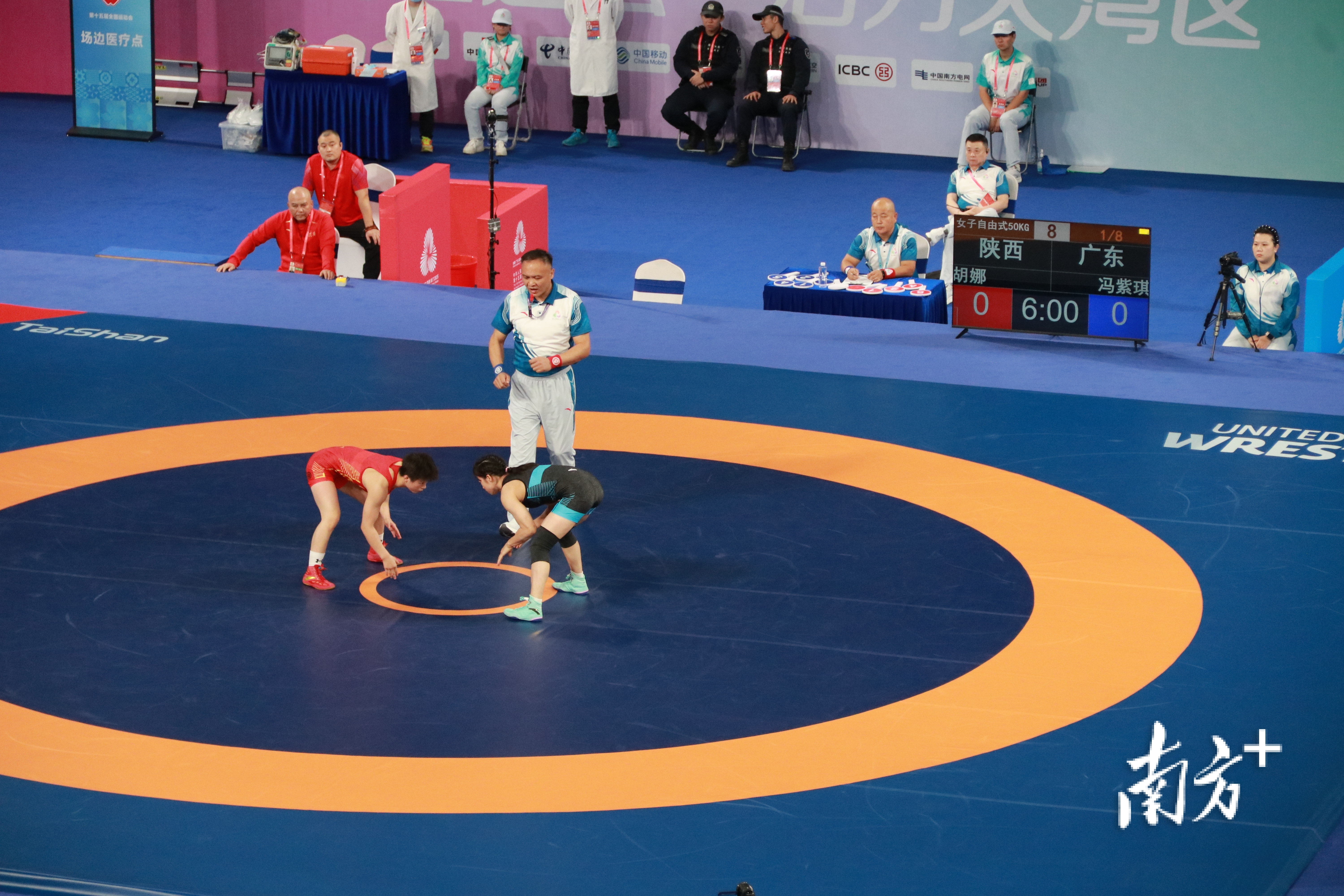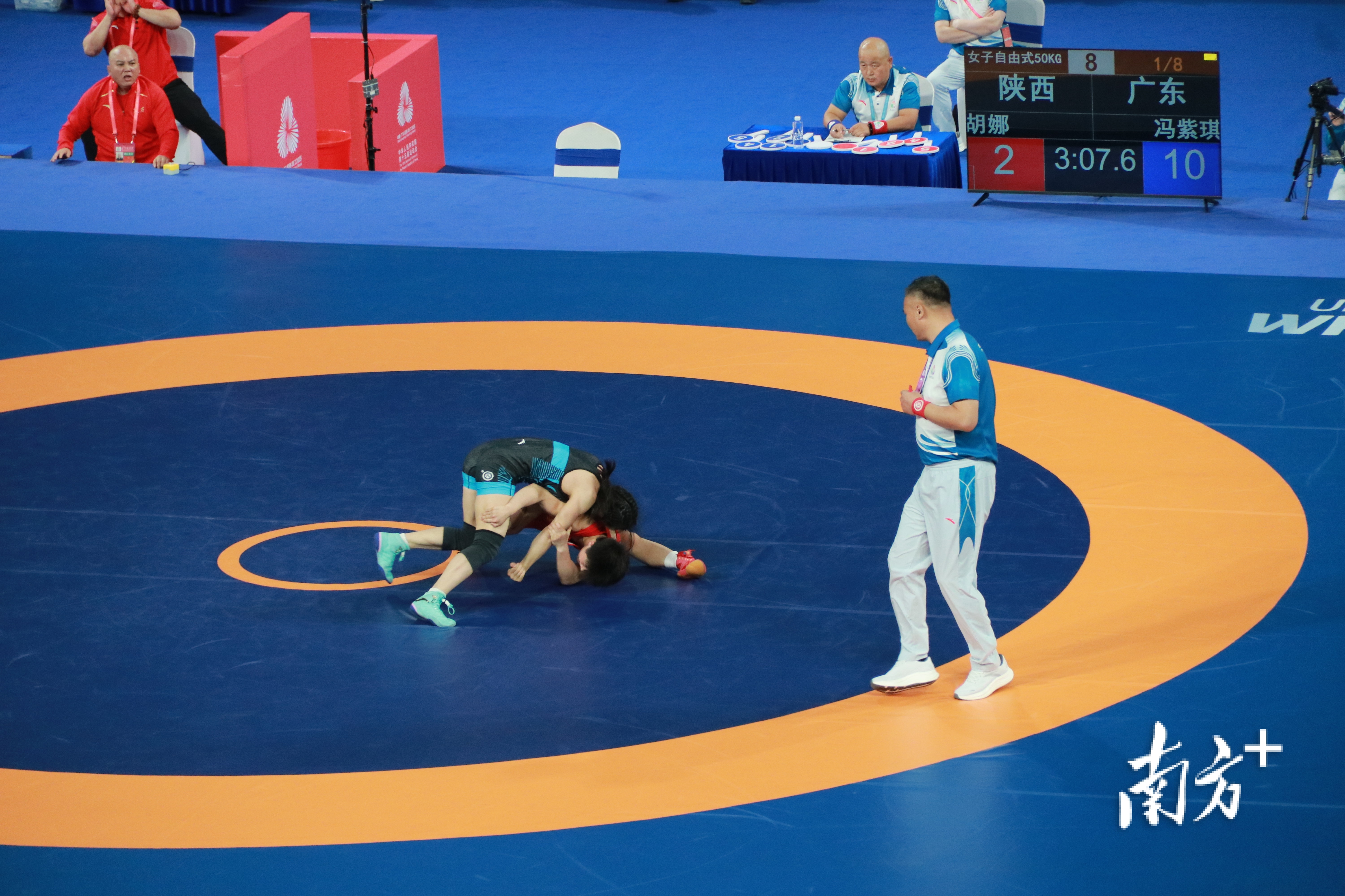 笔者留意到,巴黎奥运会铜牌得主、清远英德籍姑娘冯紫琪代表广东队在首日首场比赛中登场,参加女子自由式50公斤级金牌争夺。