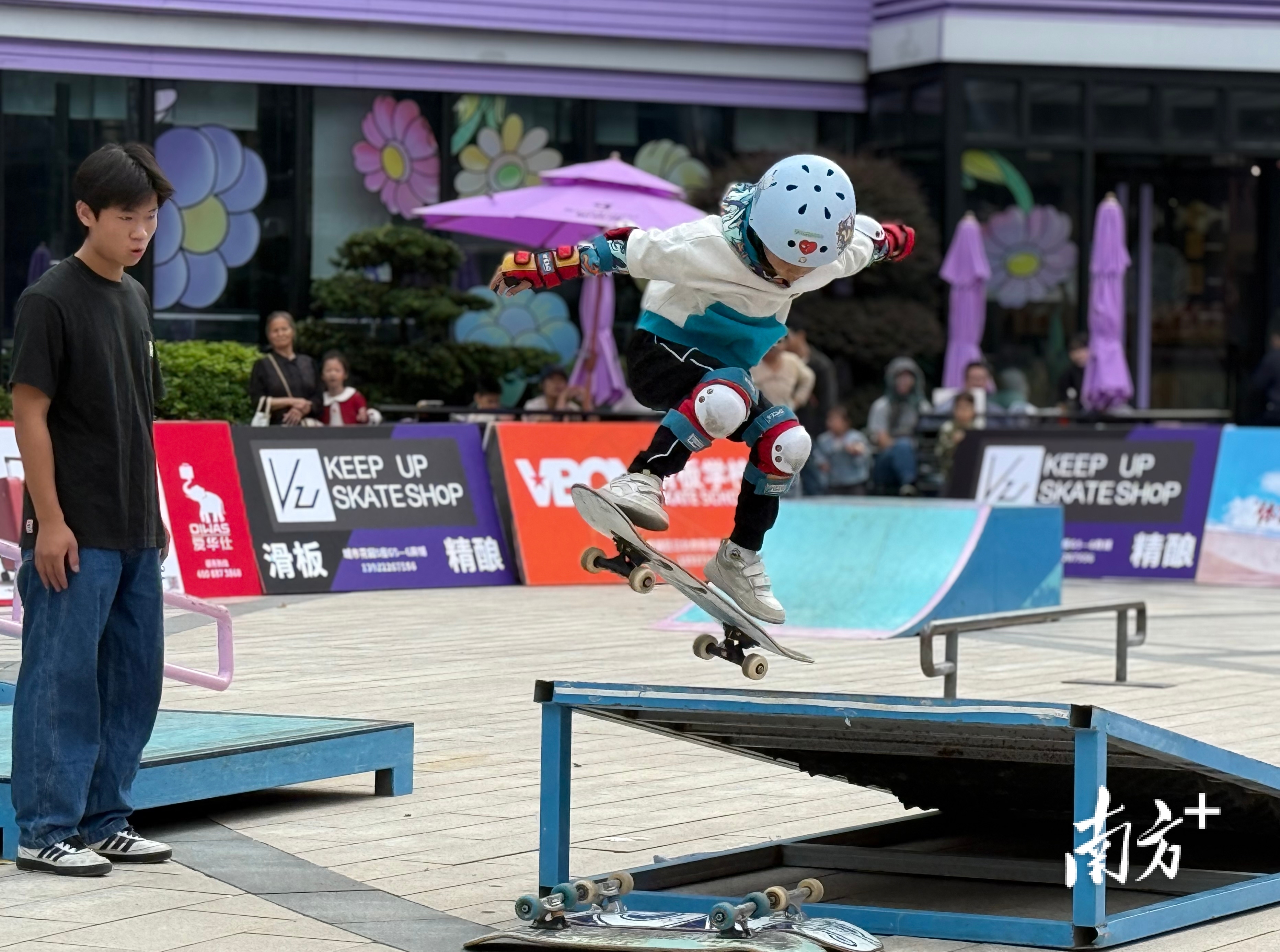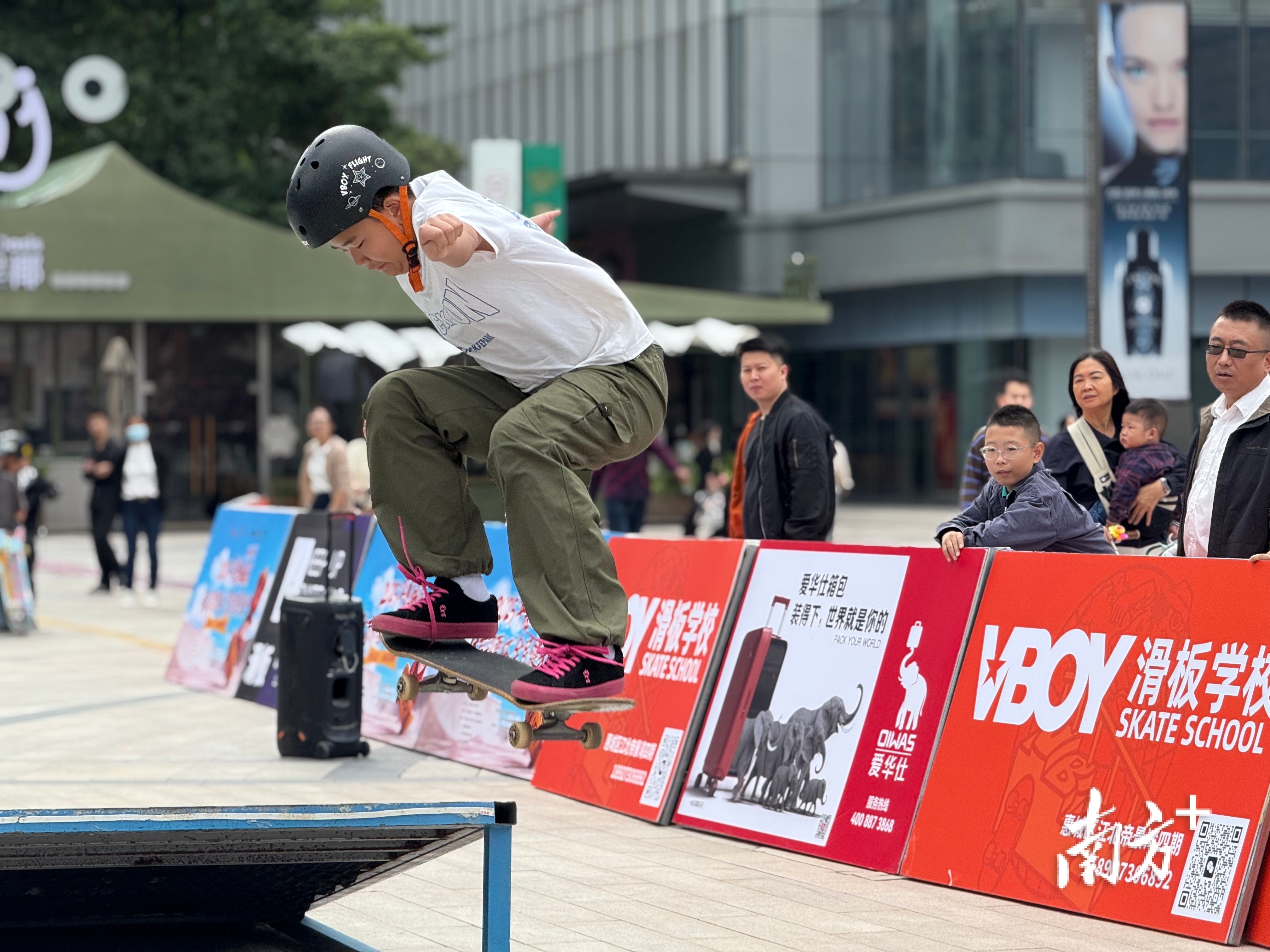 起步、滑行、借势腾空,一道弧线划过沸腾的赛场,最终,滑板稳稳接地,喝彩炸响……10月25日,华贸天地商圈里活力洋溢,这里正在举行的是由惠城区人民政府指导、惠城区文化广电旅游体育局主办的“喜迎十五运”2025年惠城区“体育彩票杯”全民健身日系列活动之滑板邀请赛。