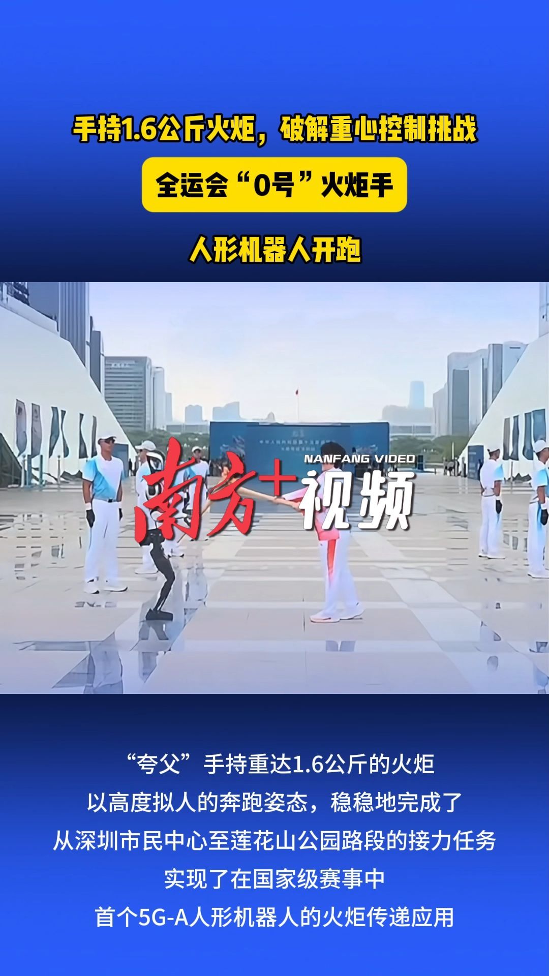 “夸父”手持重达1.6公斤的火炬,以高度拟人的奔跑姿态,稳稳地完成了从深圳市民中心至莲花山公园路段的接力任务,实现了在国家级赛事中首个5G-A人形机器人的火炬传递应用。