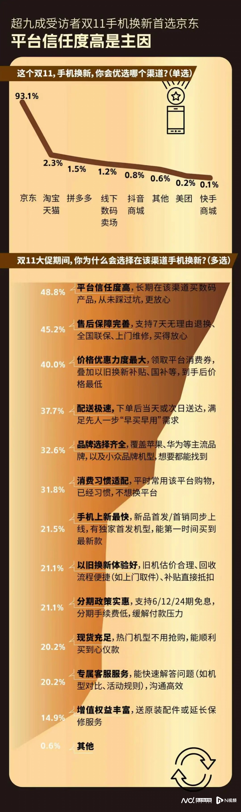 对于手机换新的渠道选择,93.1%的受访者选择京东。平台信任、售后保障、价格优惠,是消费者双11首选京东换新手机TOP3因素。