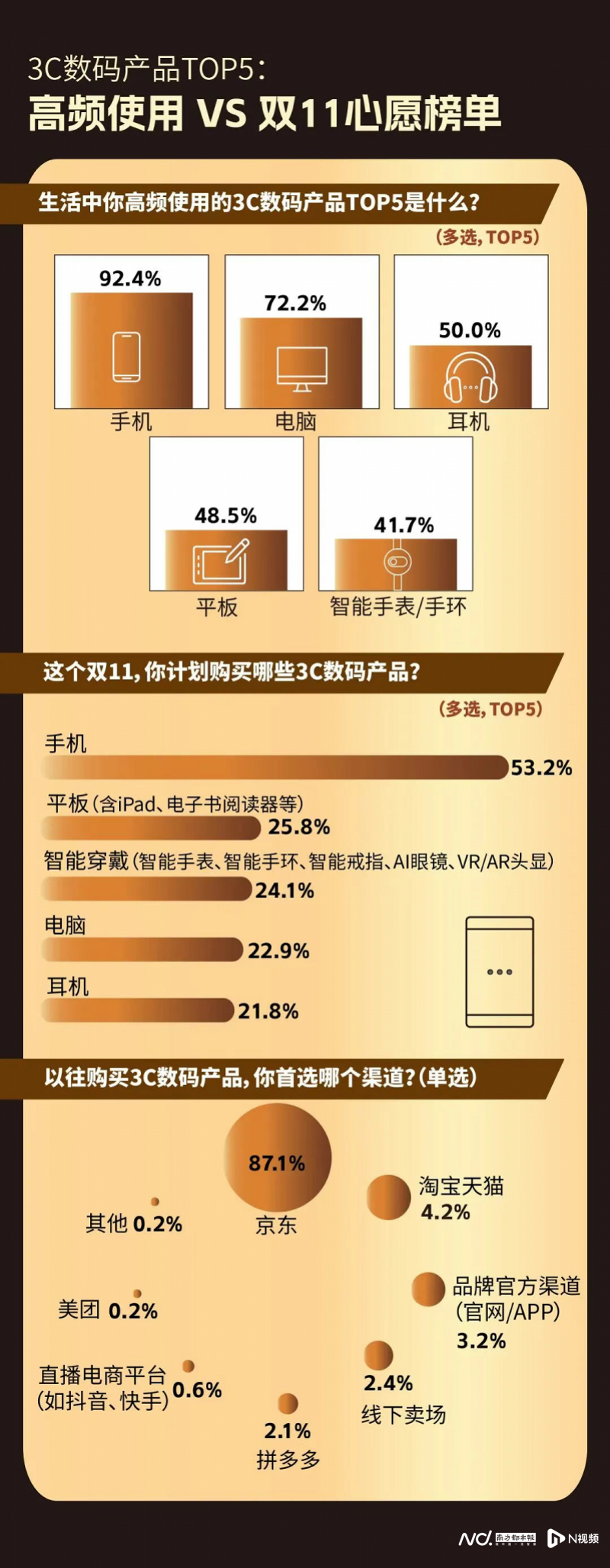 而从受访者的“种草清单”来看,53.2%的受访者想购买手机,25.8%的受访者想购买平板,24.1%的受访者希望购买智能穿戴设备,还有22.9%的受访者要购买电脑,以及21.8%的受访者要购买耳机。正品+好服务奠定多年高平台信任度,一直以来,超87%的人买3C数码产品首选京东。并且,在这个双11,精明的消费者们比价后发现,他们信任的京东依然是行业里“比价后价格最便宜、服务体验最好”的渠道。