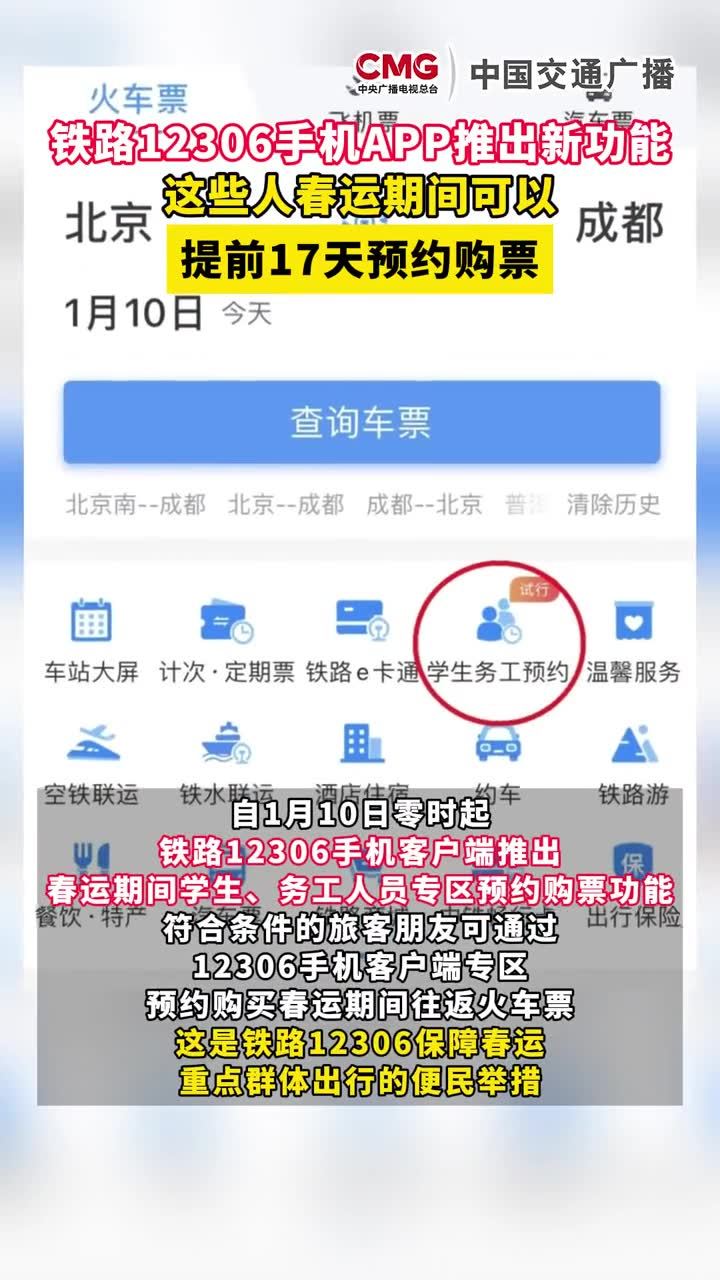 自1月10日零时起,铁路12306手机客户端推出春运期间学生、务工人员专区预约购票功能,符合条件的旅客朋友可通过12306手机客户端专区预约购买春运期间往返火车票。详情>>