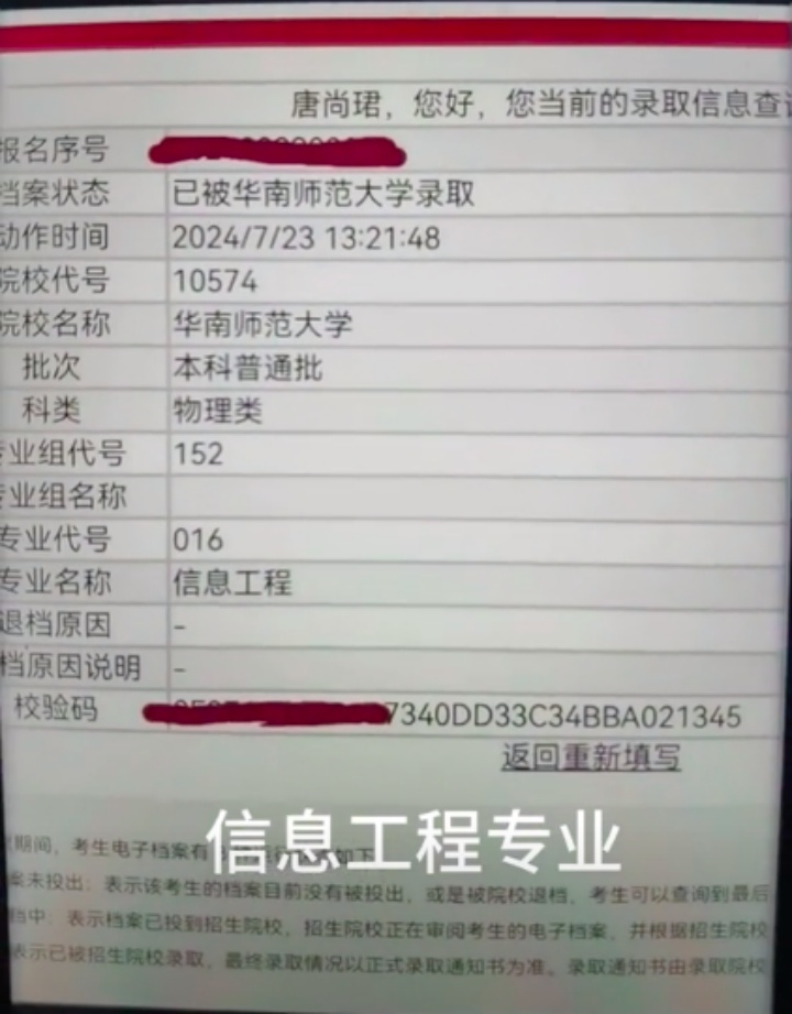唐尚珺晒出的录取信息查询显示,其档案状态已被华南师范大学录取,专业名称是信息工程。