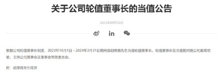 华为官网宣布,根据华为轮值董事长制度,在2023年10月1日-2024年3月31日期间,将由胡厚崑当值轮值董事长。
