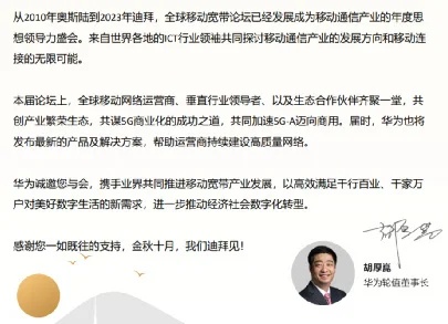 值得一提的是,胡厚崑很快或将迎来轮值董事长首秀。在10月10日-13日期间,华为将在阿联酋迪拜分别举行“2023全球移动宽带论坛”和“全球超宽带高峰论坛”。