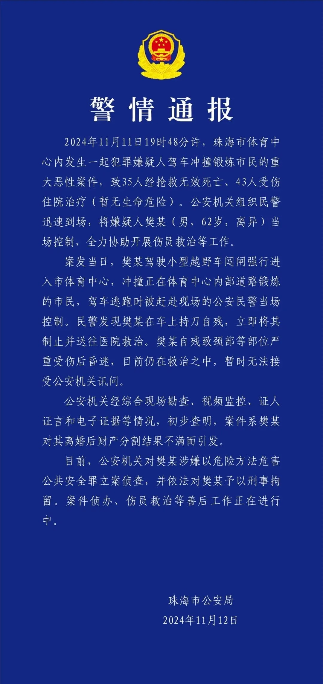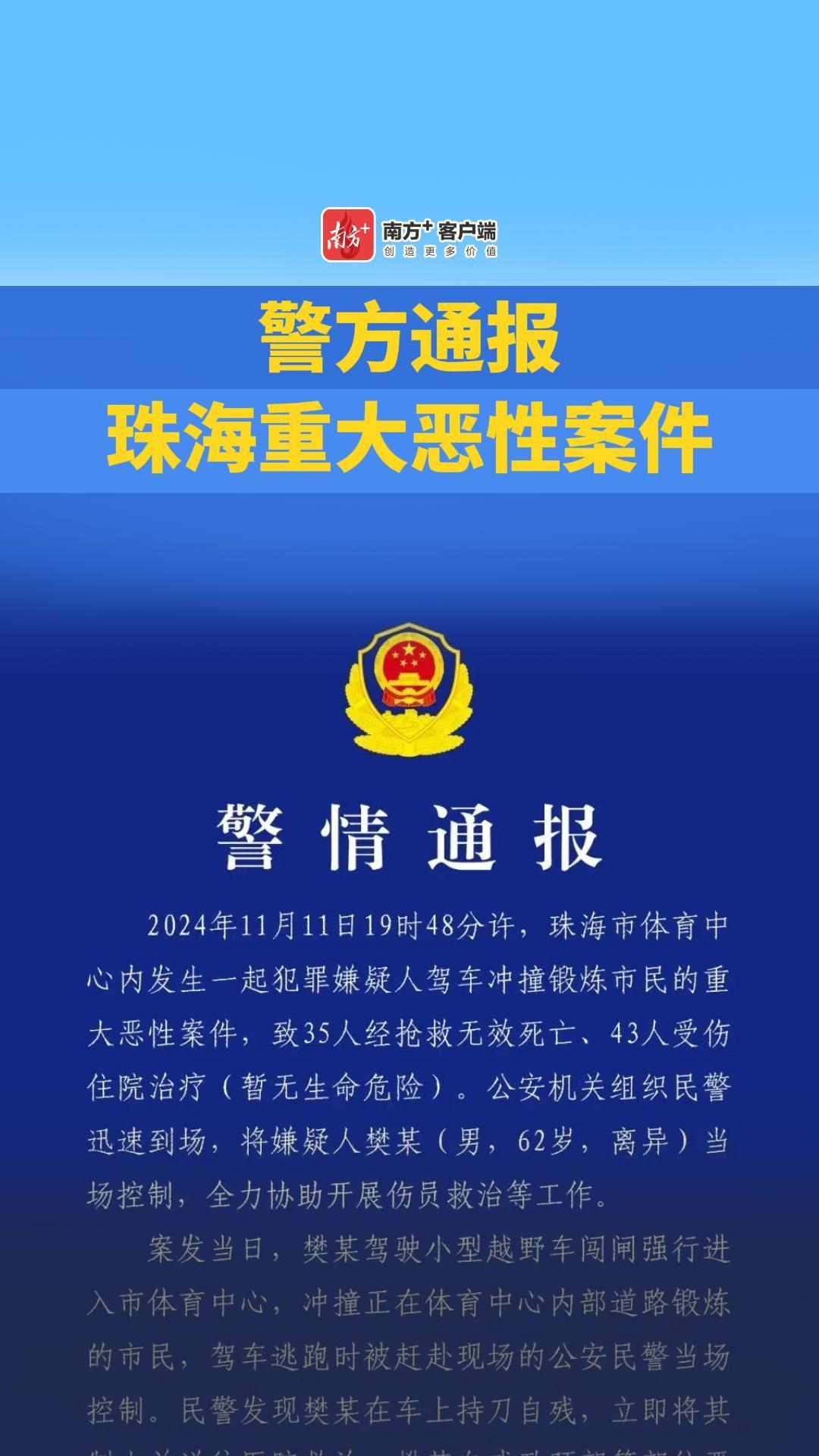 00:12 警方通报珠海重大恶性案件相关阅读珠海市驾车冲撞行人案件伤者正在全力救治依法严惩驾车撞人者,守护好人民群众生命安全南方+记者 汪棹桴 祁雷 贺达源 徐勉 曹嫒嫒 李业珅 杨琼剪辑:卓杰 版权声明:未经许可禁止以任何形式转载 编辑 朱丹 订阅后可查看全文(剩余80%)