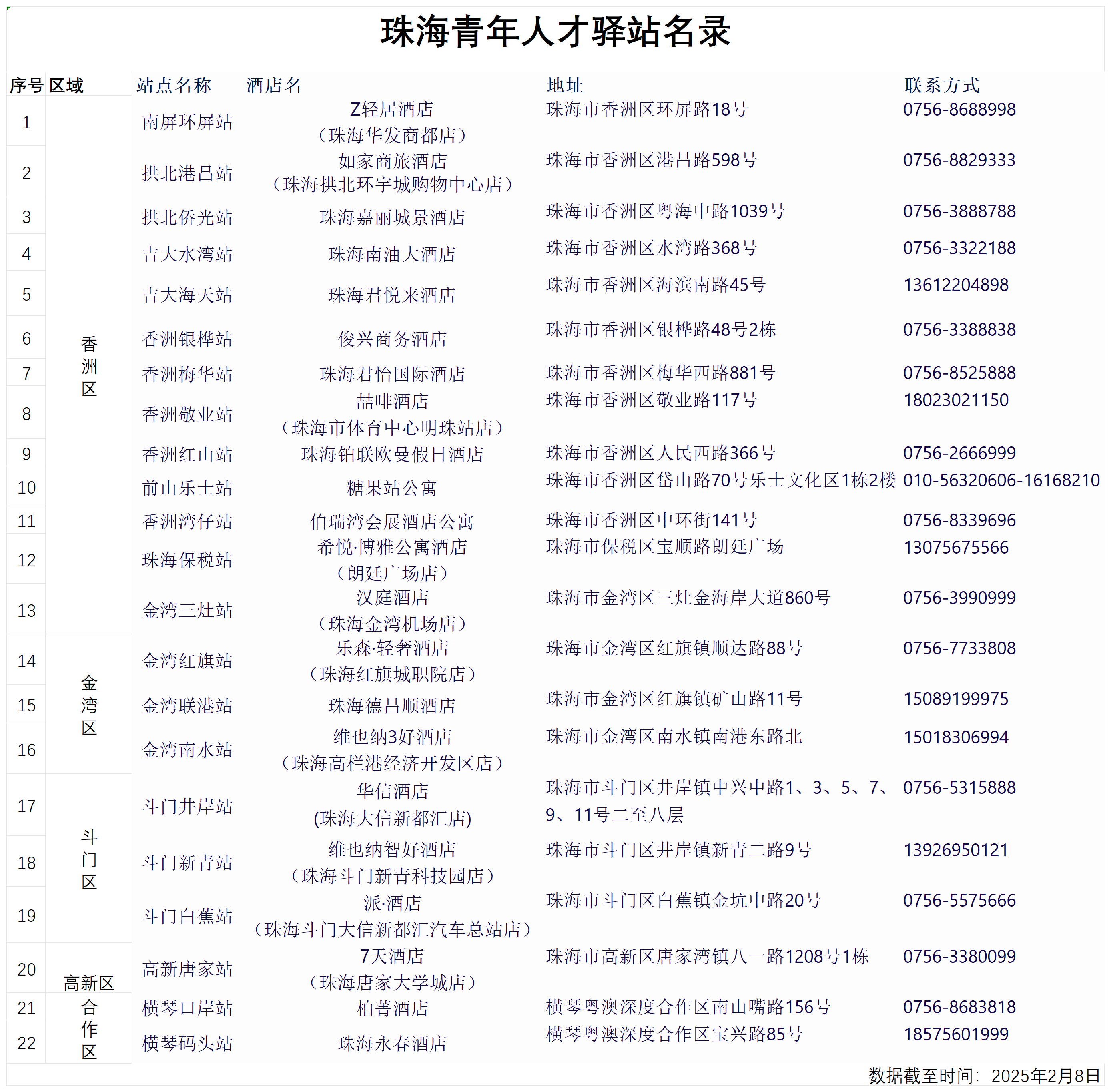 “珠海青年人才驿站”站点更新啦!珠海青年人才驿站公众号发布消息,目前全市建成22家合作酒店服务站,覆盖全市产业园区、人才市场、交通枢纽等,每年可满足超过5000人次住宿服务需求。