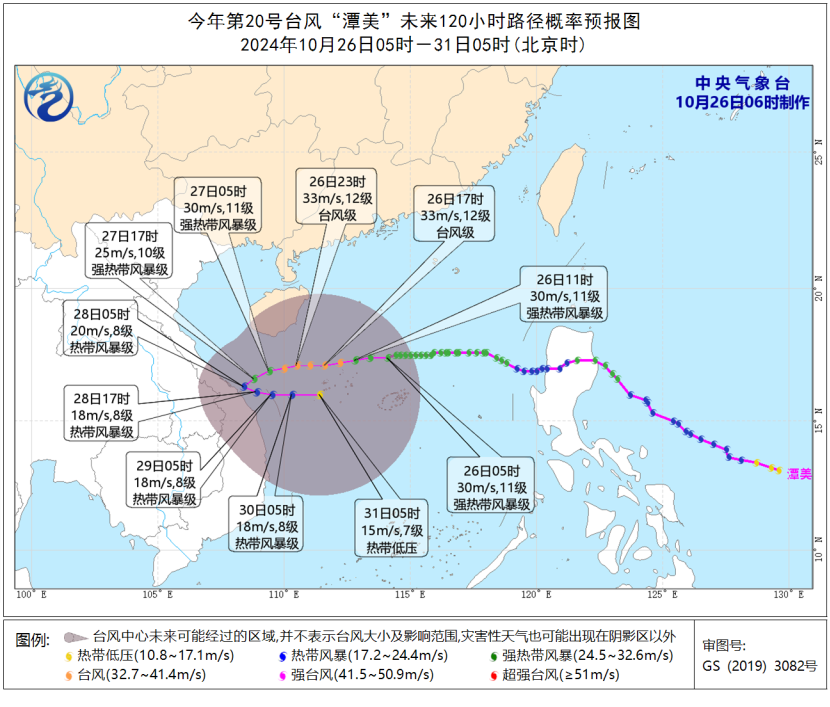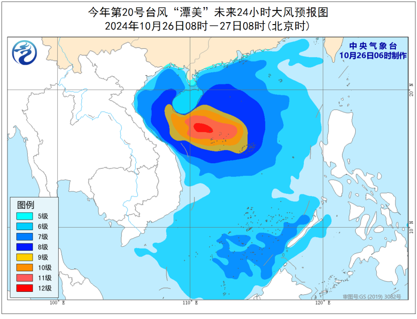 26日8时至27日8时,受冷空气和“潭美”的共同影响,南海大部海域、琼州海峡、北部湾、东沙群岛、中沙群岛以及广东沿海、广西沿海、海南岛沿海将有6-8级、阵风9-10级的大风,其中南海西北部偏南海域、南海中西部海域、北部湾偏南海域、西沙群岛风力可达9-10级、阵风11-12级,“潭美”中心经过的附近海域风力可达11-12级、阵风13-14级。