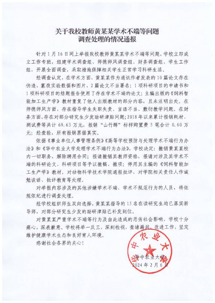 华中农业大学通报教师黄某某学术不端等问题:撤职、解聘