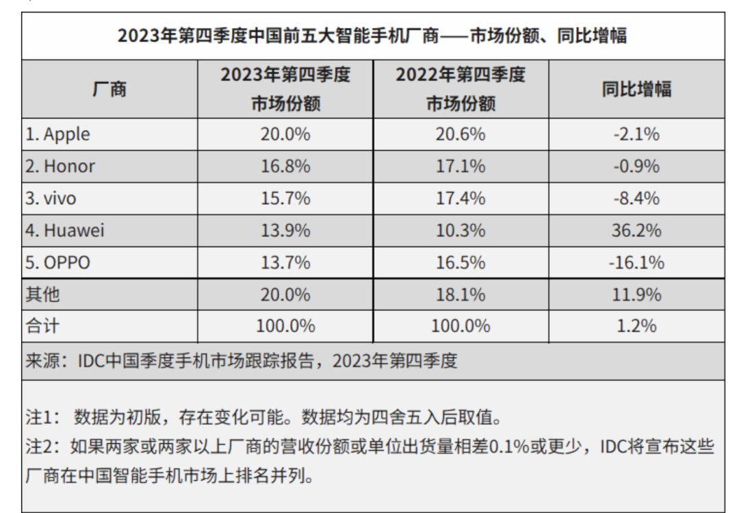 IDC报告显示,2023年第四季度,市场出货量前五名分别是苹果、荣耀、vivo、华为、OPPO,另据Canalys的数据,第五名则是小米。