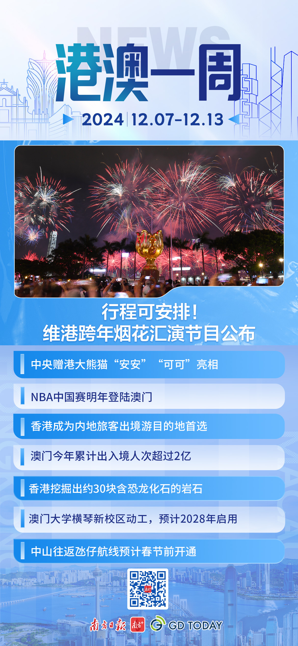 香港旅发局宣布,万众期待的维港跨年倒数烟花汇演将在12月31日举行,将以“幸福乐章”为主题,传递对美好生活的祝愿。此次烟花汇演将长达12分钟,烟花阔度长达1300米,包括绽放的多层次烟花群“繁花绽放”及糅合七色彩烟及银闪烟花的“七彩祥云”,届时维港两岸多个地方都可以欣赏到。详情>>