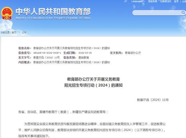 教育部办公厅关于开展义务教育阳光招生专项行动(2024)的通知