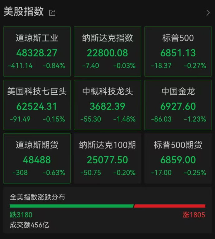 3月5日晚,美股开盘后下挫。截至发稿,道指跌0.84%,跌幅超400点;标普500指数、纳指小幅下跌。市场上,3180只个股下跌,1805只个股上涨。