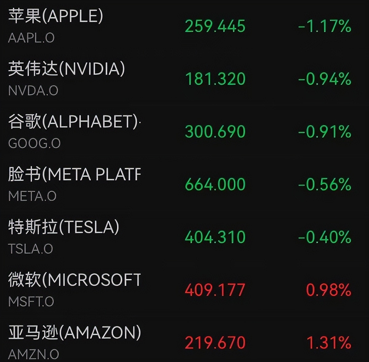 美股科技七巨头中苹果跌超1%,亚马逊涨1.3%。