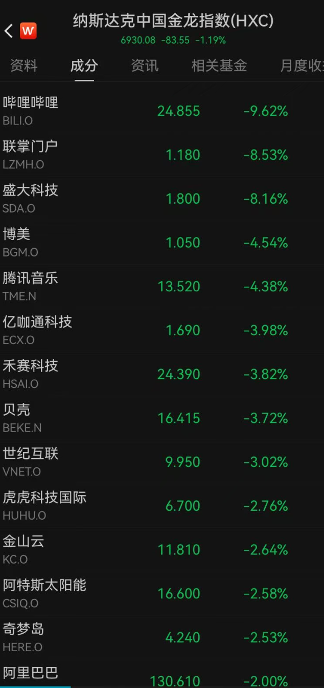 热门中概股下跌,纳斯达克中国金龙指数跌超1%。截至发稿,哔哩哔哩跌超9%,腾讯音乐跌超4%,阿里巴巴跌2%,腾讯控股ADR跌1.68%,美团ADR跌2.58%。