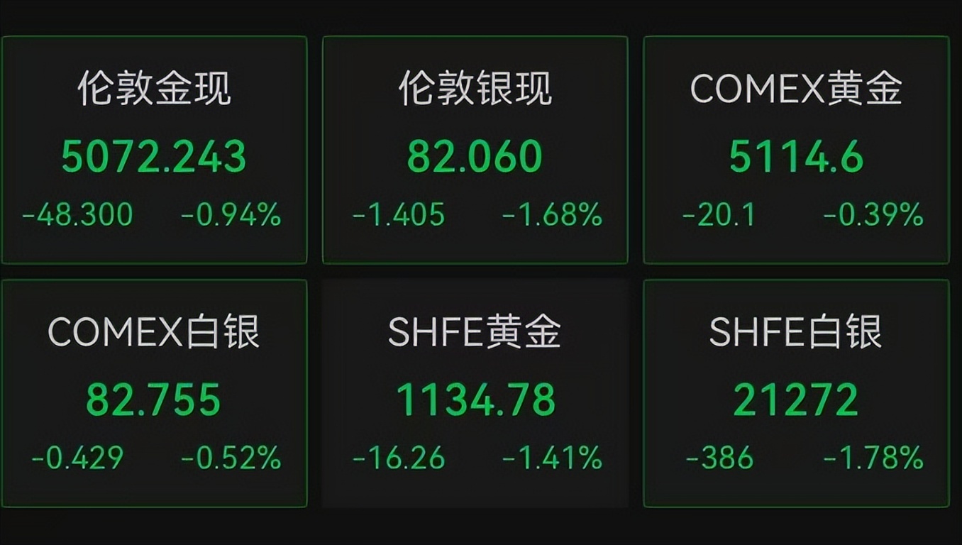 截至发稿,现货黄金跌1%,报5072美元/盎司;现货白银跌1.68%,报82美元/盎司。