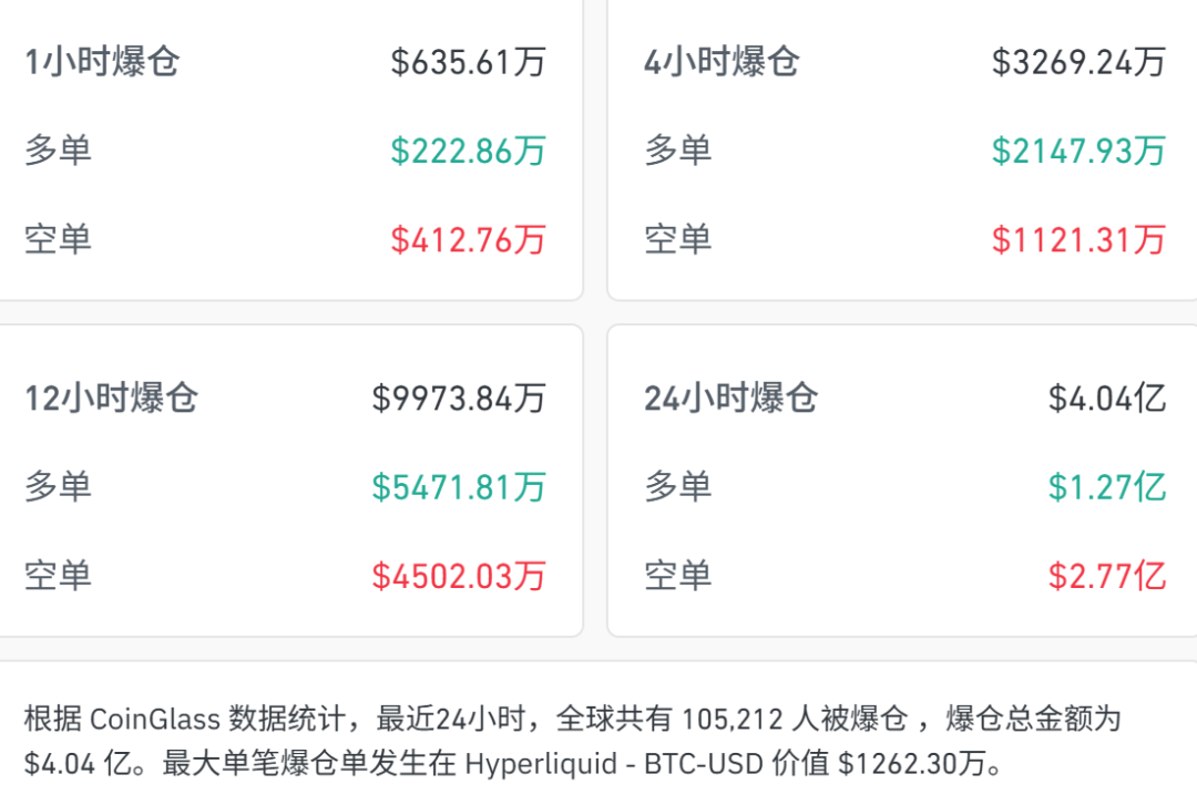 加密货币市场下跌。截至发稿,比特币、以太坊跌1%。根据CoinGlass数据统计,最近24小时,全球共有超10万人被爆仓,爆仓总金额为4亿美元。