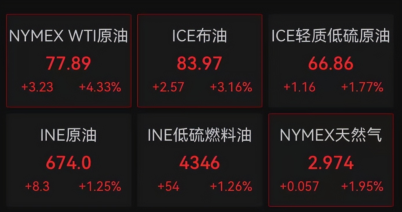 国际油价大涨,截至发稿,WTI原油报77.89美元/桶,日内涨超4%;布伦特原油报83.97美元/桶,日内涨3%。