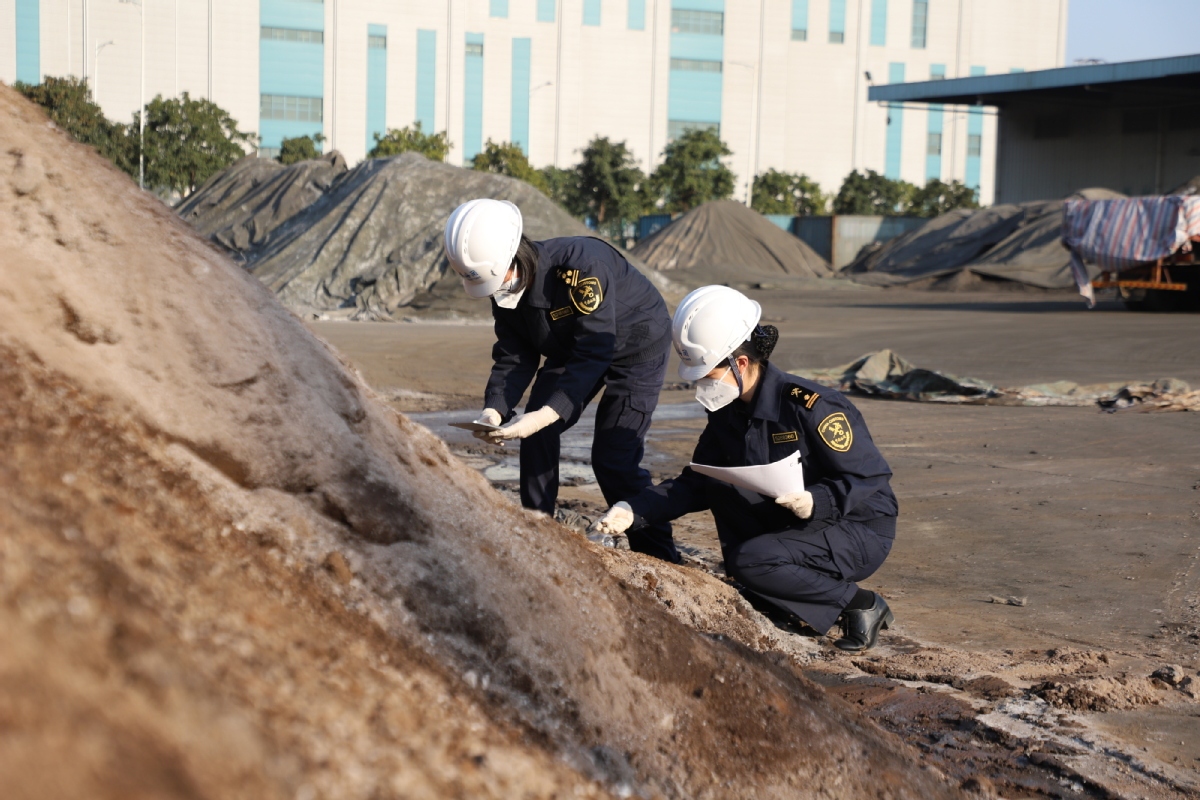 近日,黄埔海关所属沙田海关对2票申报为“铅矿及其精矿”的进口货物实施查验时,发现该批货物整体呈红褐色或浅灰色,夹杂有破烂编织袋,且其表层出现板结情形,在品相、外观、夹杂物等方面与正常铅精矿(黑色粉末状)存在明显差异。经取样送检鉴定确认,送检样品有典型的有色金属冶炼加工副产品的特征,该批货物属于我国禁止进口的洋垃圾,共计1353.8吨。