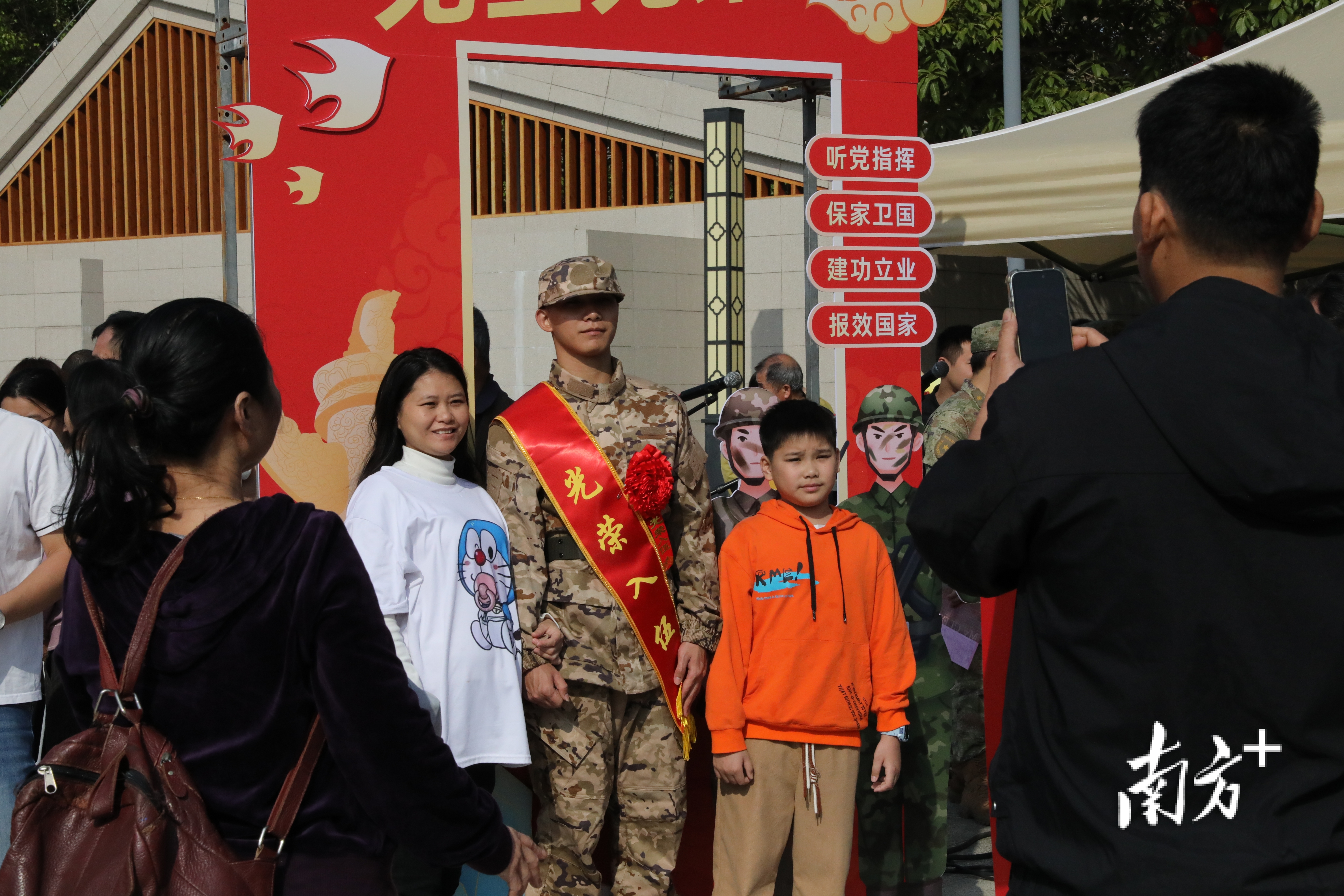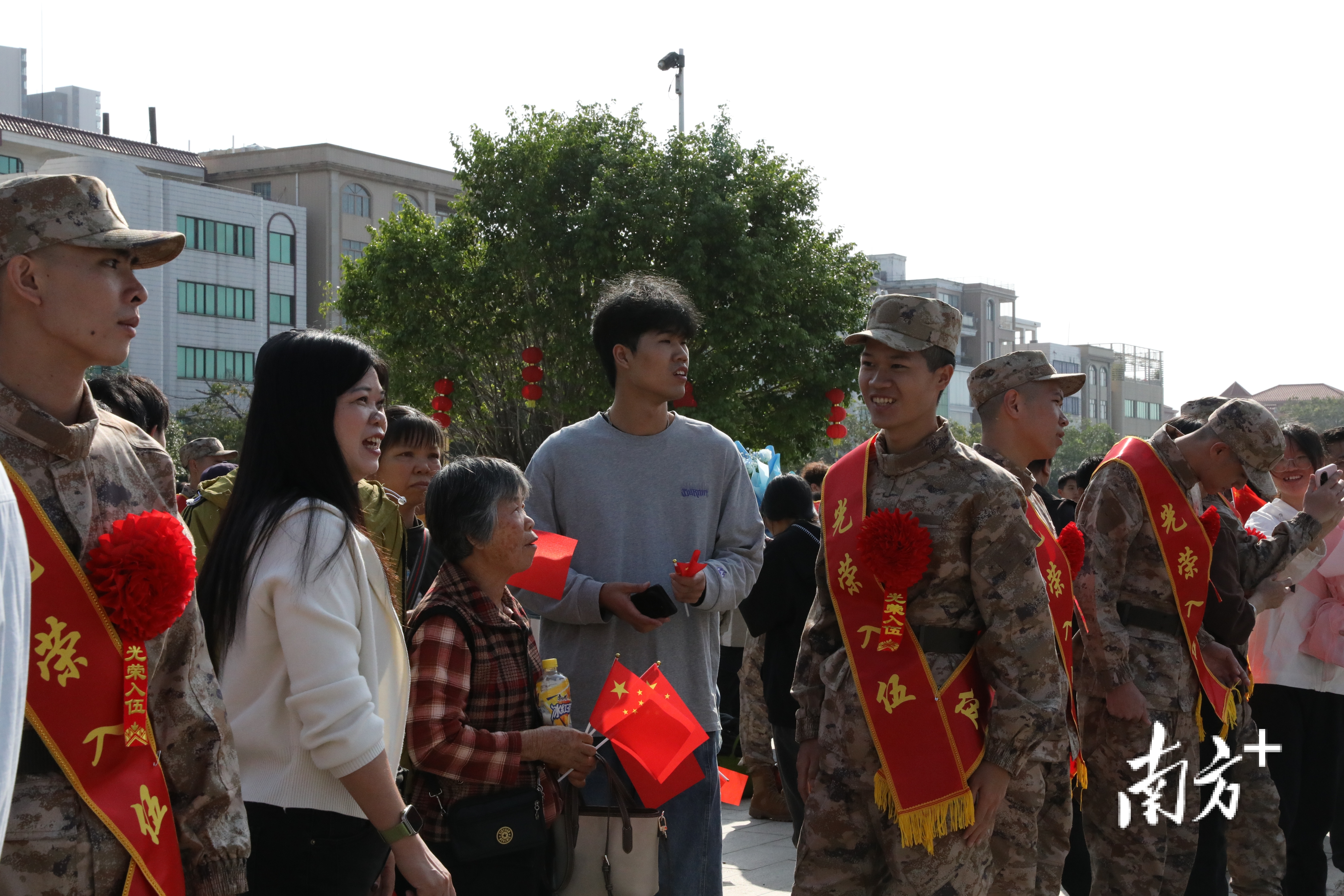 现场不断有亲友赶来送行。“这是我儿子第一次离家,既不舍又自豪。看着他穿上军装、戴上红花,我知道他长大了,要去为国家作贡献了!”一位新兵家长眼眶湿润,却难掩脸上的骄傲,手中的相机不停闪烁,为孩子记录下离家前的最后一段家乡影像。现场不少家长与孩子紧紧相拥,叮嘱的话语、不舍的泪水,交织成动人的亲情画面。