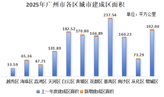 近年来,广州城市化水平不断提升。截至2025年10月31日,广州各区的建成区面积分别为:越秀区(33.59km²),海珠区(65.36km²),荔湾区(47.73km²),天河区(101.89km²),白云区(182.52km²),黄埔区(170.80km²),花都区(166.89km²),番禺区(237.54km²),南沙区(160.23km²),从化区(73.29km²),增城区(192.00km²)。