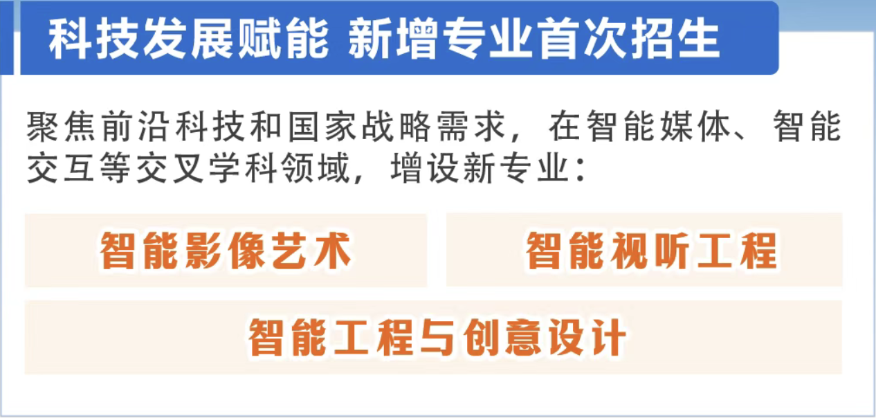 2025年,中国传媒大学共有76个本科专业招生。为了聚焦前沿科技和国家战略需求,中传2025年新增了“智能影像艺术”“智能视听工程”“智能工程与创意设计”3个本科专业。