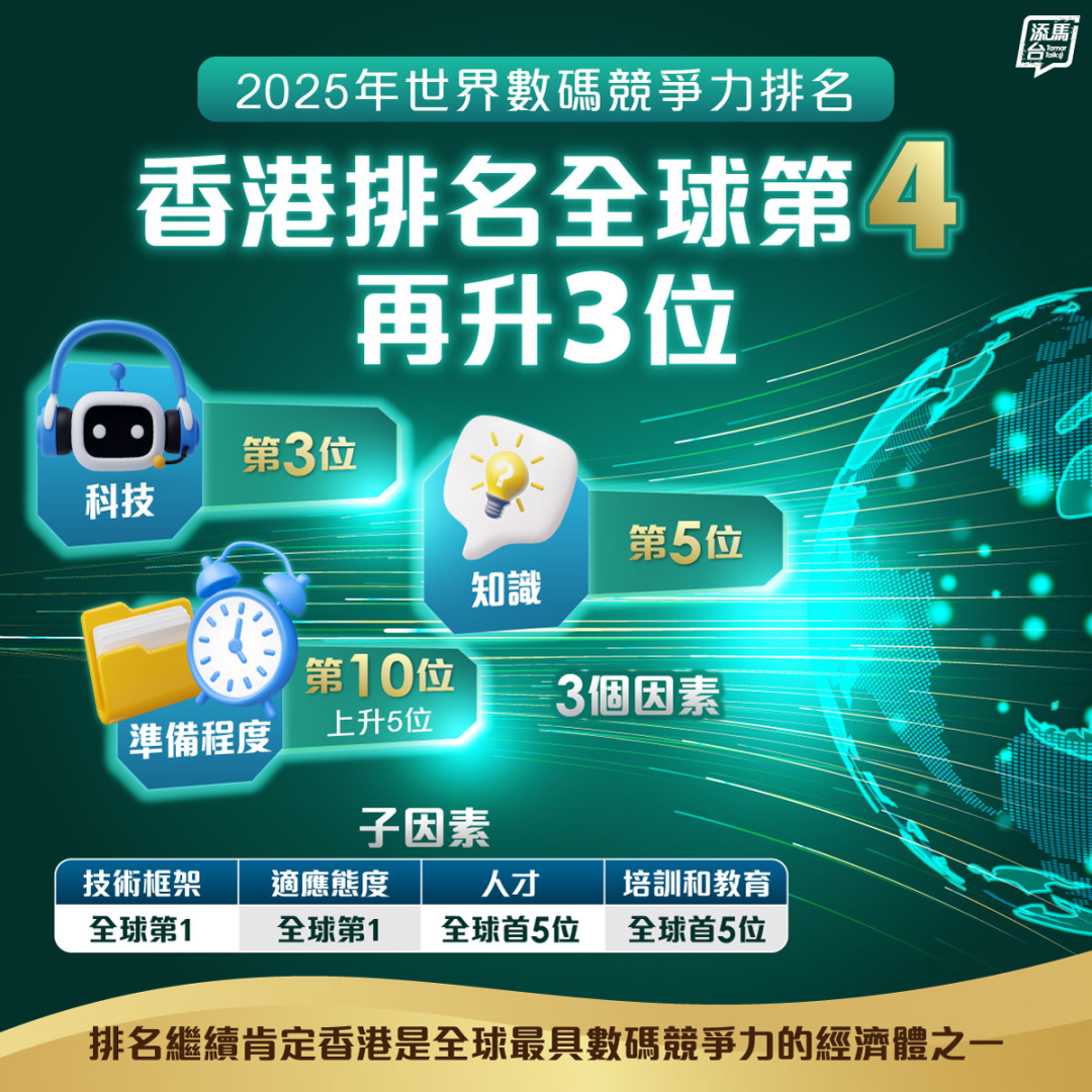 国际管理发展学院发布《2025年世界数码竞争力排名》,香港排名全球第四位,是继去年上升三位后再升三位。在排名的三个因素中,香港继续在“科技”和“知识”方面表现出色,分别维持全球第三位和第五位。详情>>