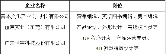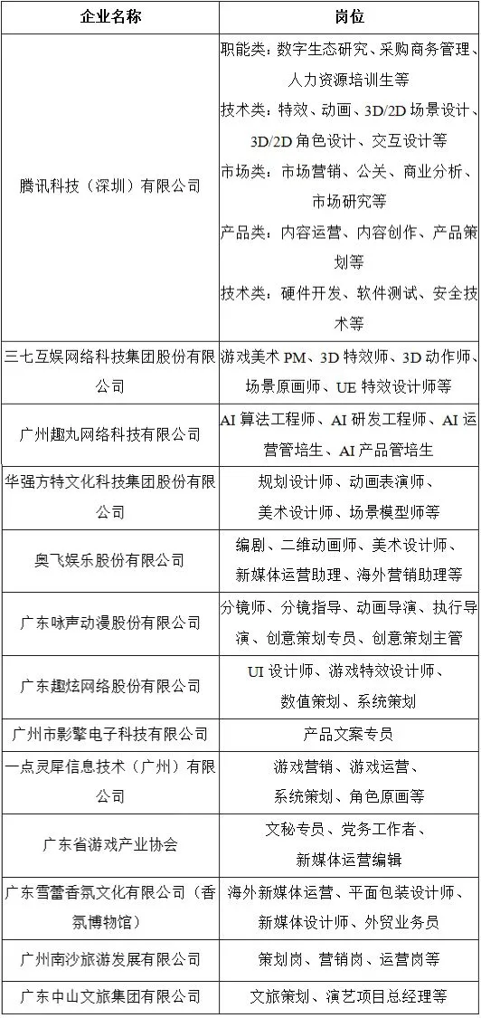 本次招聘活动聚焦广东文化产业“六大政策包”重点支持领域,涵盖影视、演艺、动漫、网络游戏、电子竞技、网络视听等热门板块。
